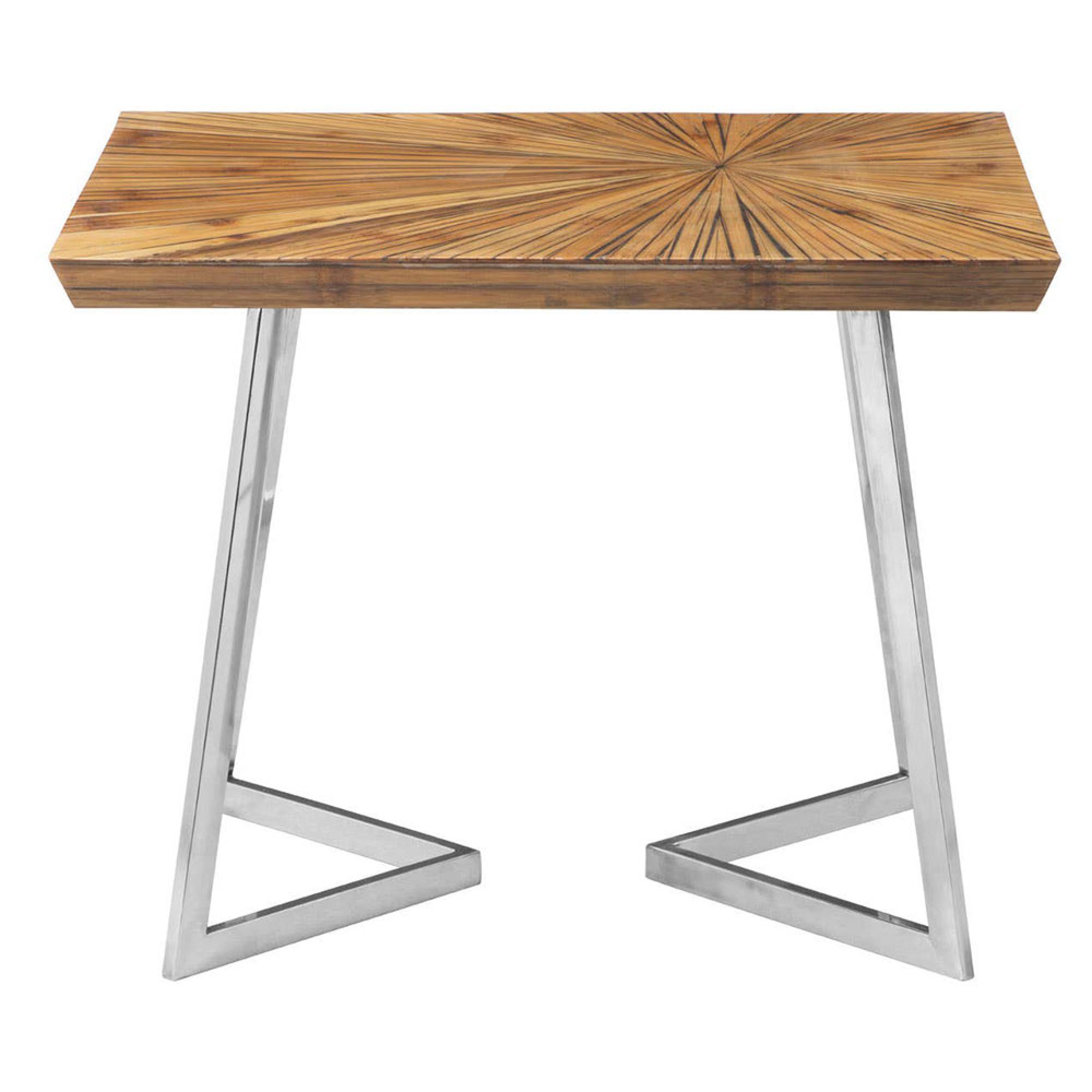 Item Code: 5527568 This contemporary side table will be a stylish and practical addition to a modern home with its sculptural base in metallic silver hues.A rectangular, renewable bamboo wood tabletop is supported by stainless steel, angular sledge legs, combining to form a triangular design at the base. Natural grain gives texture to this side table and metallic detail ensures it is a modern piece.