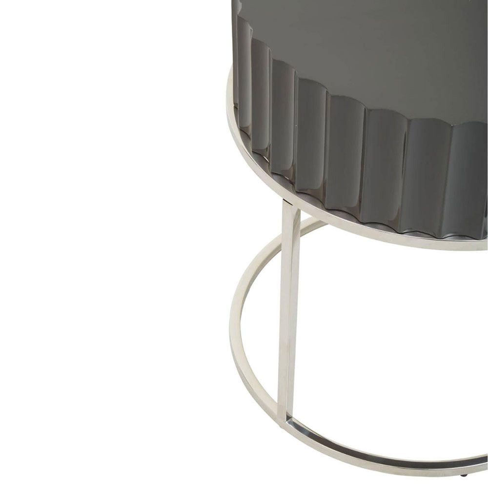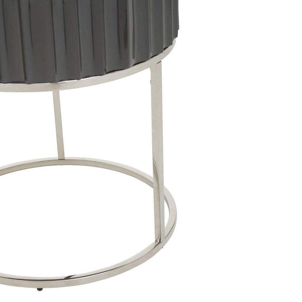Item Code: 5528607 Sleek and stylish, the Genoa round end table with a grey finish will complement modern living or bedroom decor.This is a modern and stylish side table with a sleek design. The tabletop features a round, high gloss grey finish with a beautiful fluted texture. It is supported by a minimalist and sturdy stainless steel base, creating a contemporary and elegant accent piece.
