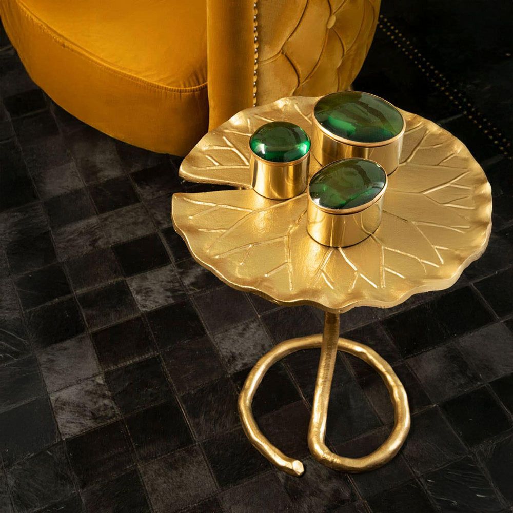 Item Code: 5528257 This side table will be an artistic style statement to the living space with the rich gold finish and floral inspired form.The Inventivo side table has a scalloped top featuring the carved-out texture of a flower. This side table is fixed over a stem-shaped base that creates an instant focal point in the room.