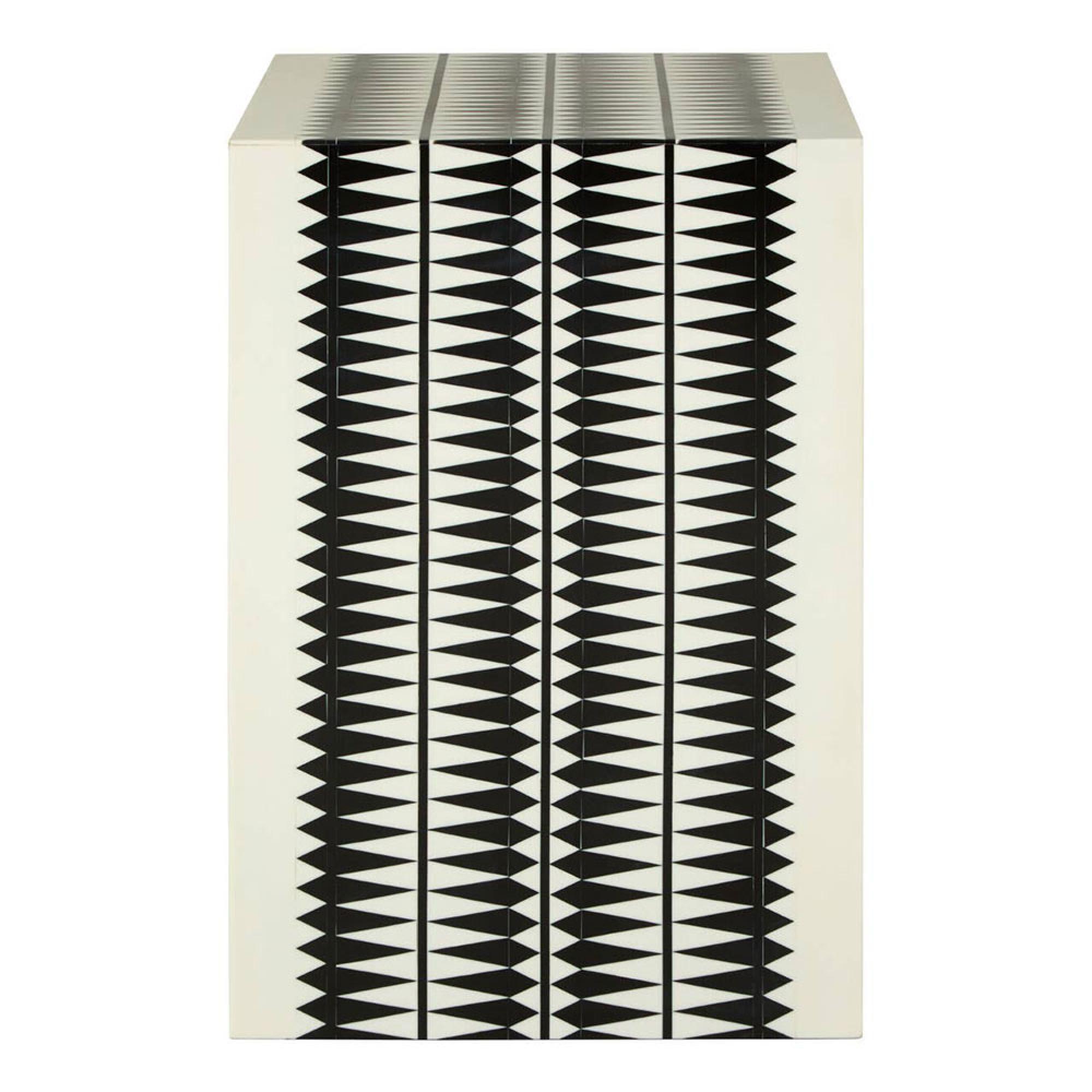 Item Code: 5502469 The Issey resin stool and table feature a bold black geometric pattern against a crisp white surface, adding a contemporary monochromatic accent to the space.This stool is a striking modern accent piece for modern interior settings. Its bold black geometric pattern against the white background creates a visually captivating focal point, while the smooth resin surface adds a tactile element. This piece offers both aesthetic appeal and functional flexibility, serving as an eye-catching stool or a convenient side table.