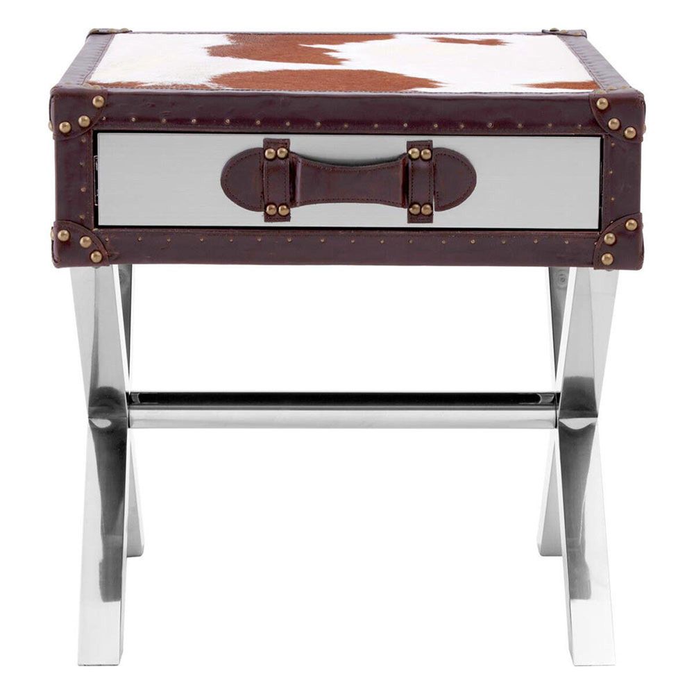 Item Code: 5501173 The top of the table is designed in the form of an antique suitcase and is covered in brown and white cowhide.Its crossed legs are made from stainless steel and complement the table's silver metal stud detail. The drawer has a stainless steel face and real leather strap handle that matches the trim around the table.