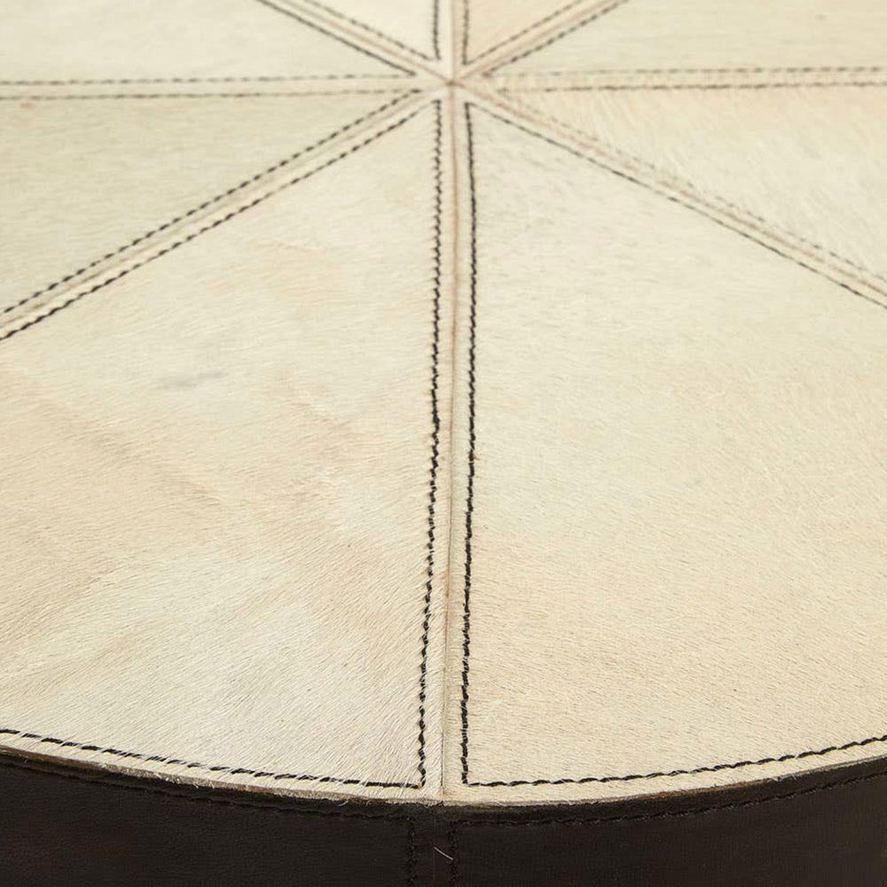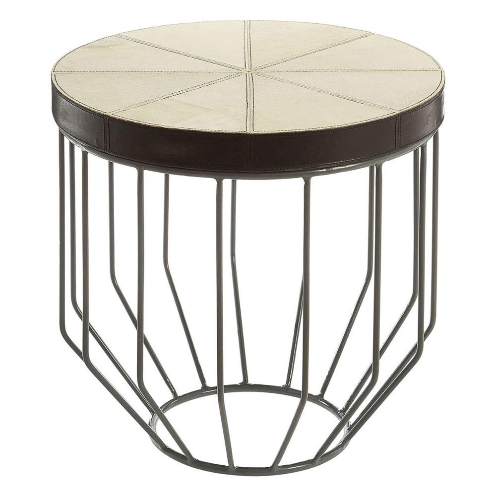 Item Code: 5501753 The Kensington Townhouse side table has a luxurious genuine leather top and wedged iron bar legs.The frame of the round tabletop is made from eco-friendly mango wood and is dressed with genuine white and brown leather. A series of stitched lines create a wedge design on the table's top surface. These lines complement the tubular iron bar legs that descend from the top and angle at the bottom to produce a circular base.