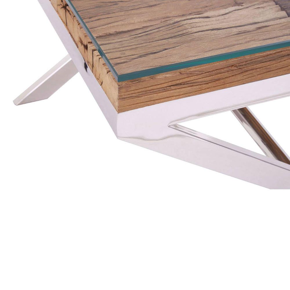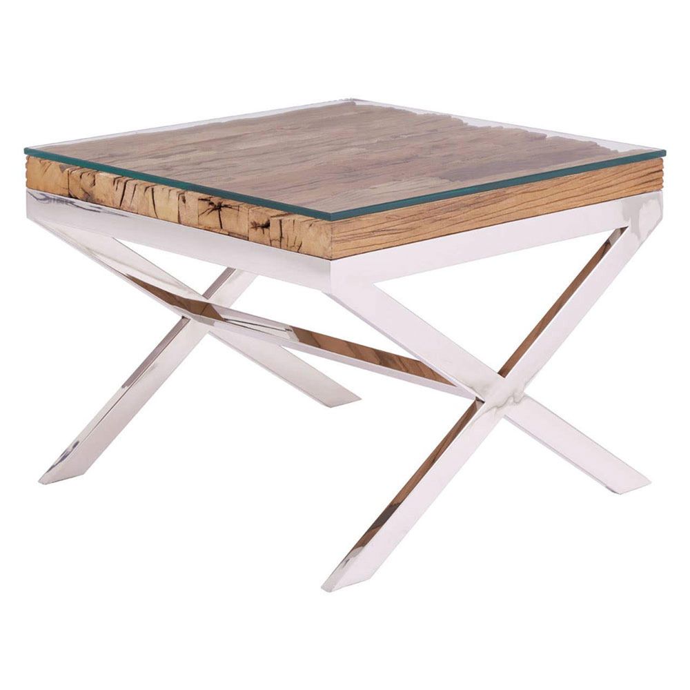Item Code: 5527848 With the simple form and minimalism, this side table will enhance the modern living room decor.Natural salvaged wood forms rectangular top of this side table, further enhanced with the clear glass slab. The cross base in mirrored silver finish offers a tonal contrast to the natural elements and rustic texture.
