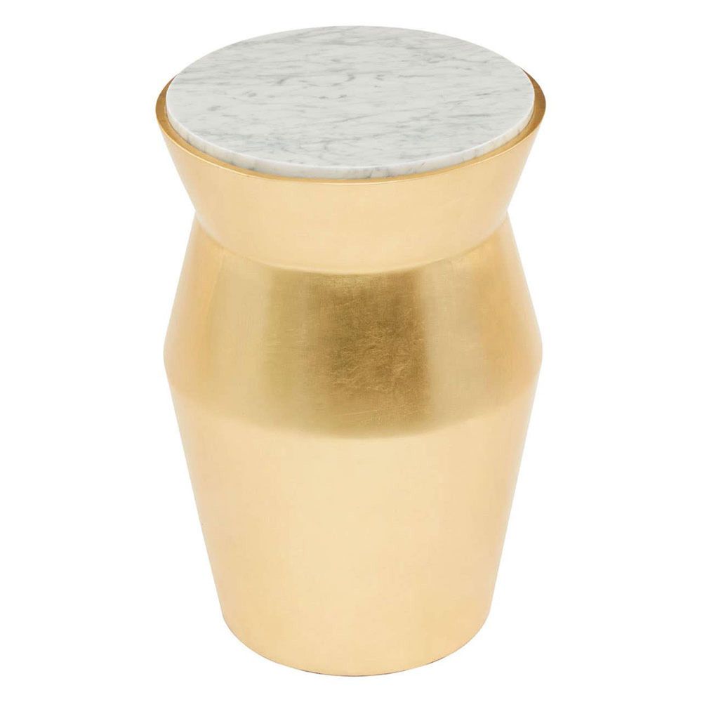 Item Code: 5502913 Reinterpreting the traditional drum design with white marble on top, this large Lino side table is sculptural and distinctive.The table tapers inwards and outwards creating an angular design that echos an asymmetric hourglass. The unique base is finished in a rich tone of gold, while a slab of luxurious white marble provides a light counterpoint.