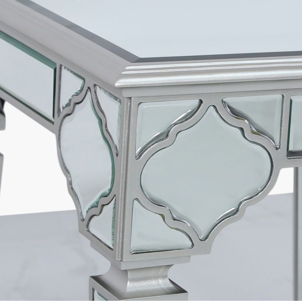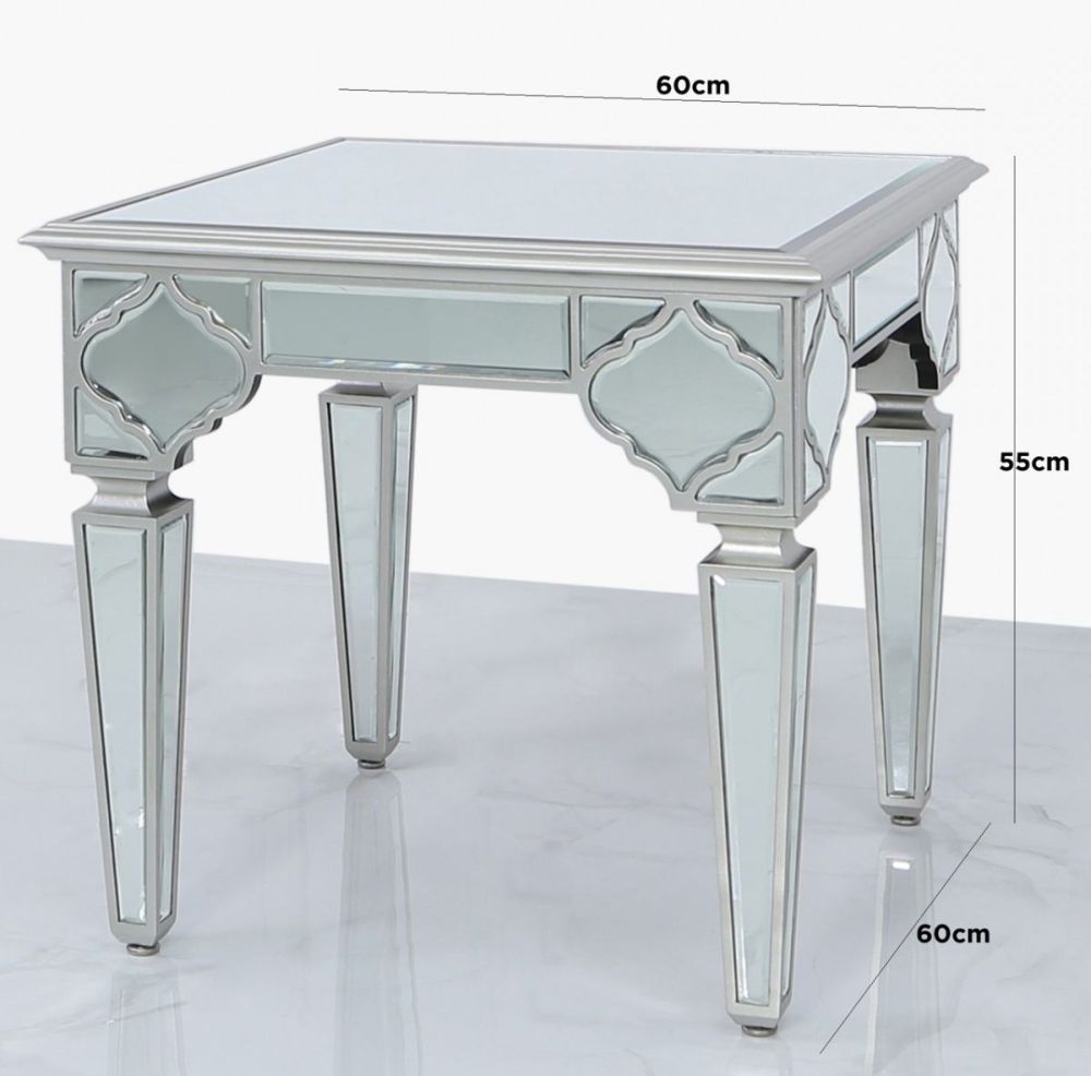 Item Code: MRF148-00-SV This stylish end table adds a touch of sophistication to any room. Its sleek construction is made of wood and finished with a mirrored silver for a modern look. Easy to assemble, it fits perfectly against any wall and will be an eye-catching addition to your decor. The end table comes without storage for a sleek, understated look.
