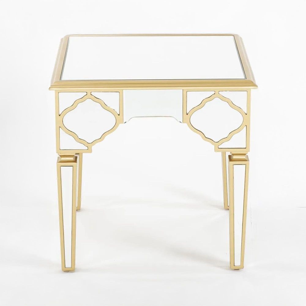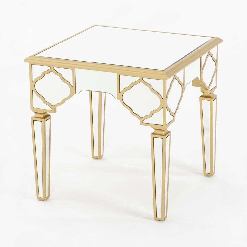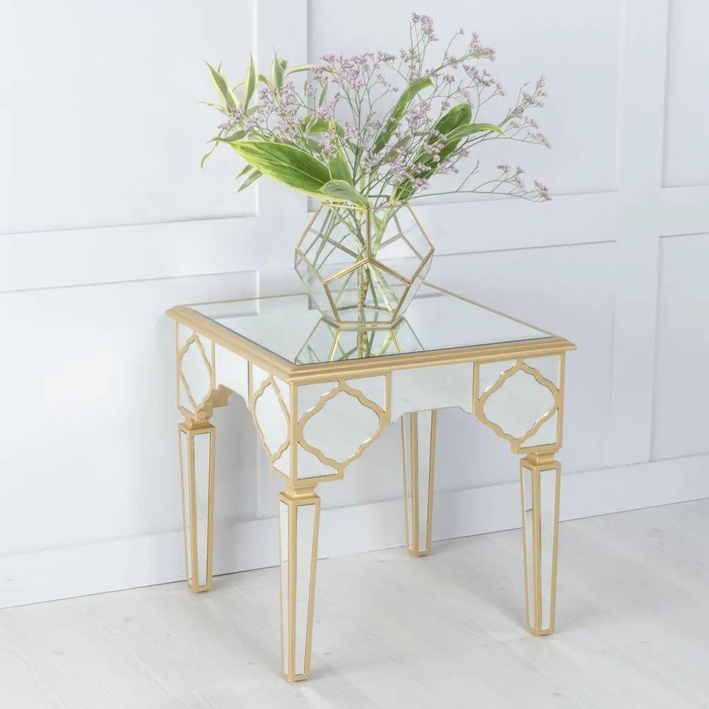 Bring a touch of refined elegance into your home with the Casablanca Mirrored Gold Trim Square Side Table. Designed with a blend of luxury and practicality, this table is a striking piece of mirrored furniture that reflects both light and style. Its square mirrored top creates a bright, airy effect, while the ornate gold trim adds a sense of timeless craftsmanship.