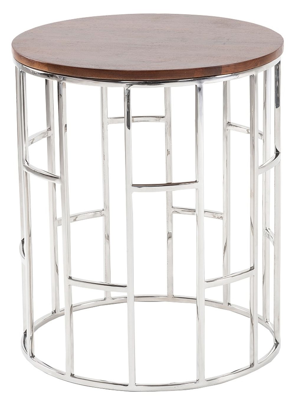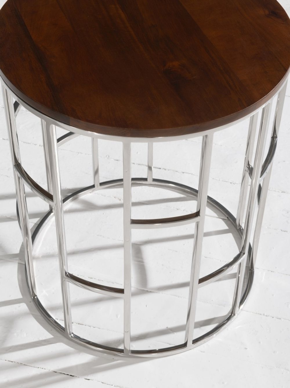 Item Code: AI-2351 This stylish side table pairs a sleek chrome base with natural wood for an elegant, modern look. Crafted of stainless steel and a round mango wood top, it offers timeless style. Perfect for a living room or bedroom, the walnut and chrome finish adds a touch of sophistication. Add this unique piece to your home for a stunning, fashionable look.