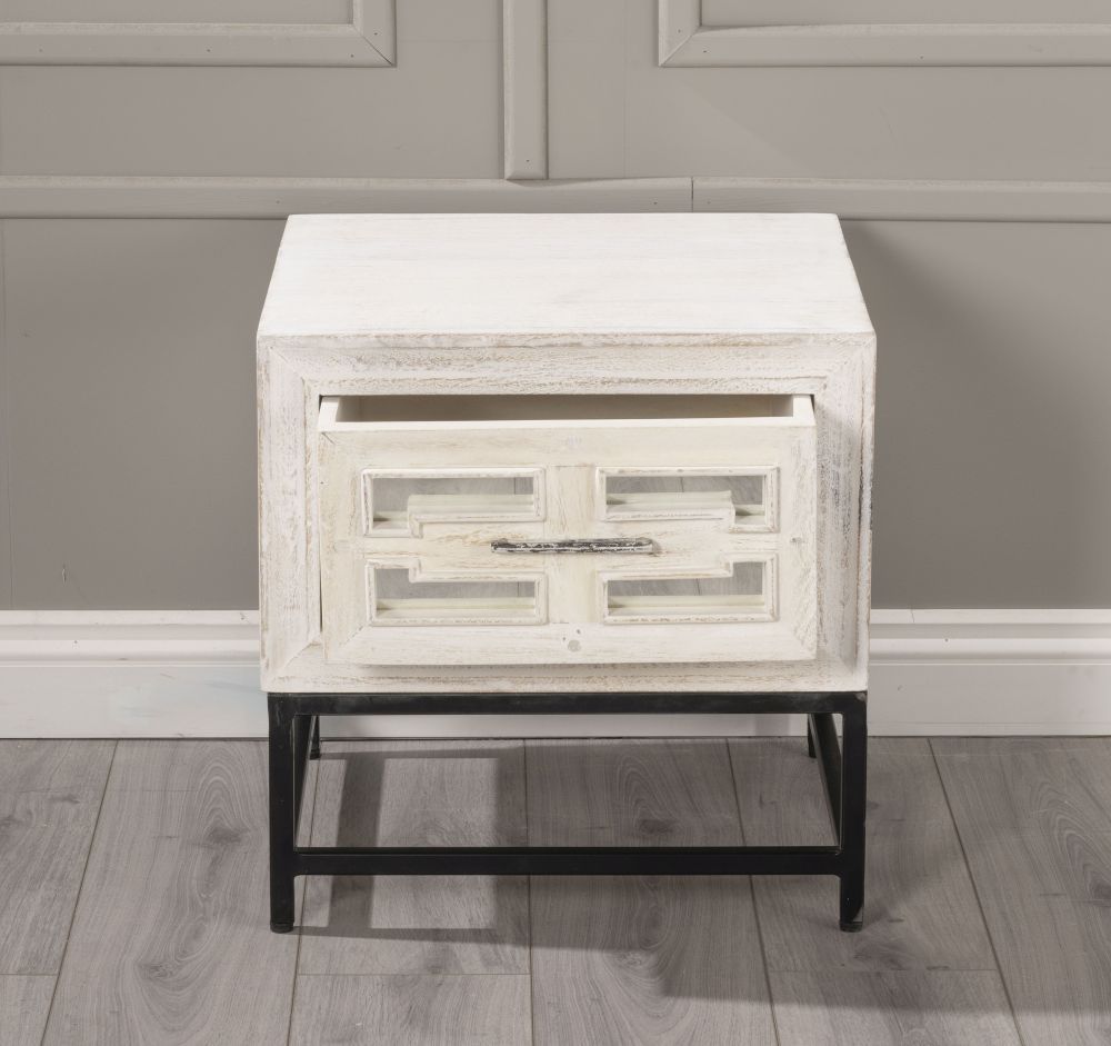 Item Code: ABW-015-White-AP This gorgeous side table is made from mango wood with a distressed white wash finish, adding a vintage charm to any home. It has a single drawer and storage to help organize your items. Perfect for any room, it will add a unique touch to your decor.