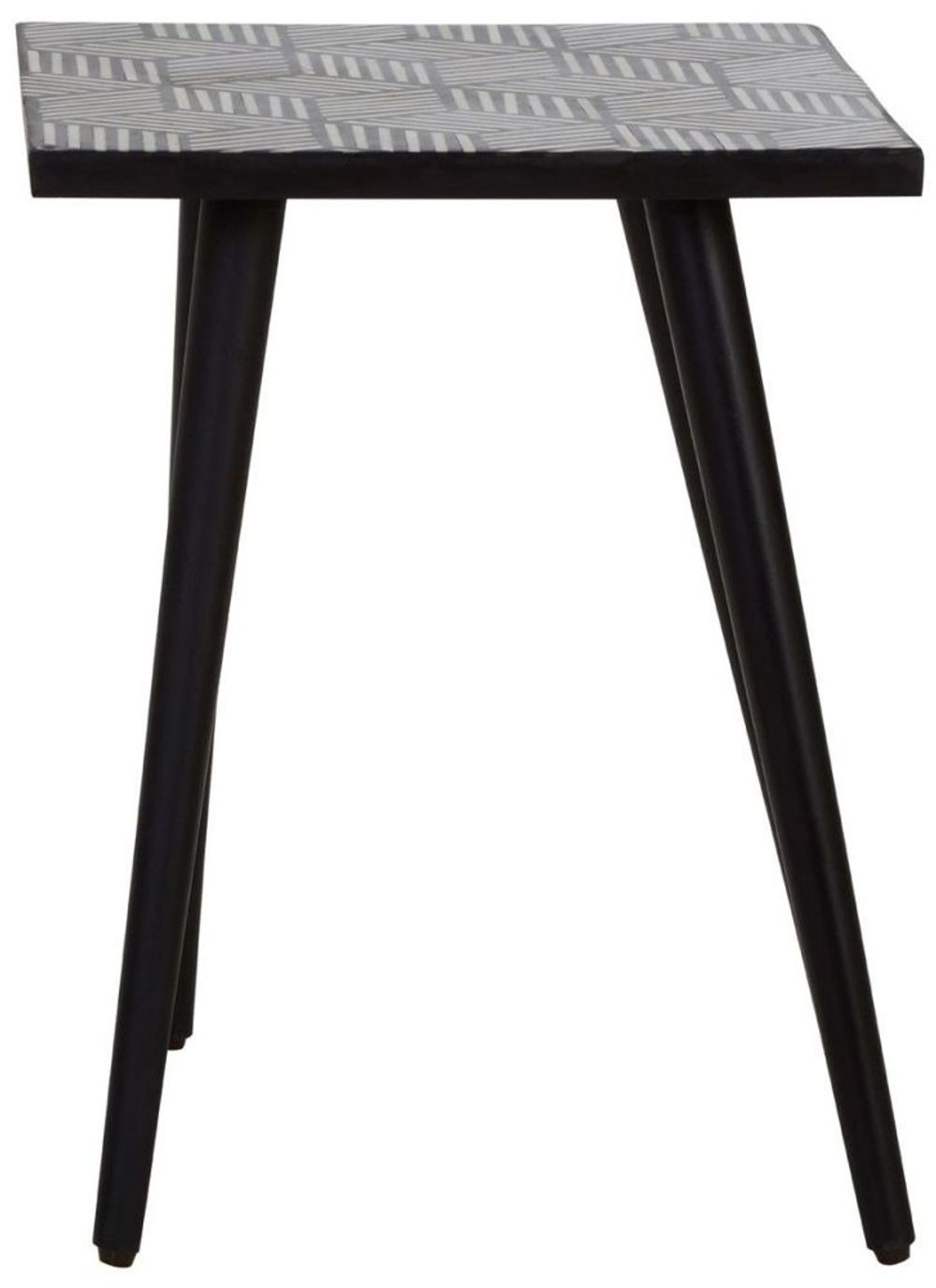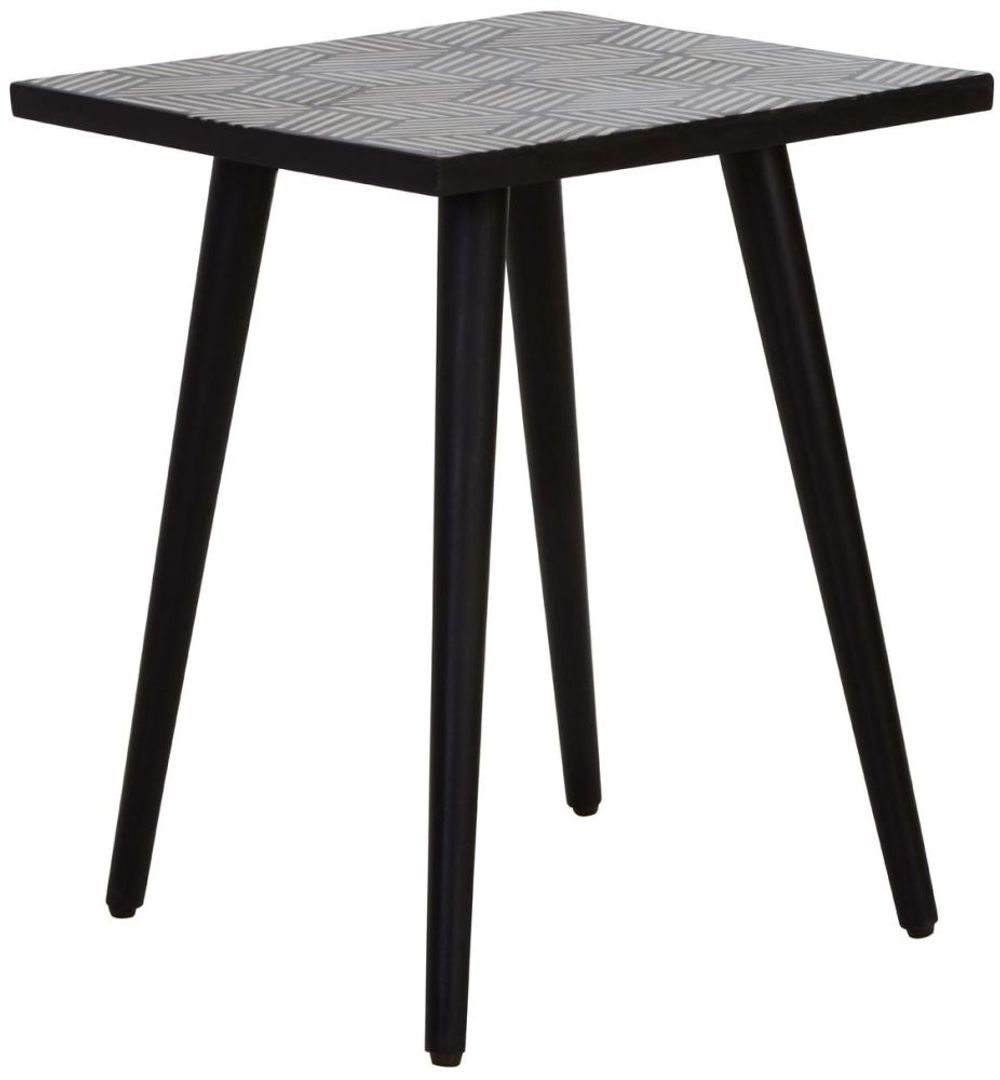 Item Code: 5527272 Introduce a minimal, monochromatic accent with this simple, but striking side table. Several Intricate strips of bone inlay combine to form the decorative square top of this side table. Made from renewable acacia wood, dark hued legs are angled to coordinate with the clean, patterned top.