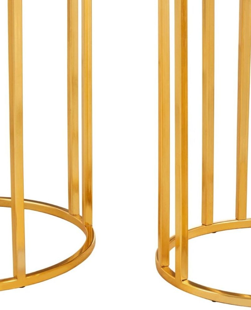 Item Code: 5502818 Each of the two Templar side tables feature marble tops that counterpoint the reflective, warm metallic bases. The Templar side tables are minimal and elegant with unimposing round white marble tops that rests on a simplistic base. The tables linear, open design frame boasts a rich gold finish that contributes to their luxurious aesthetic. These contemporary accent pieces are ideal for complementing boutique hotel inspired interiors.
