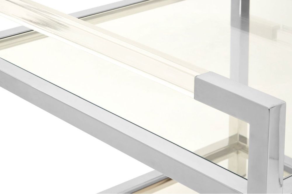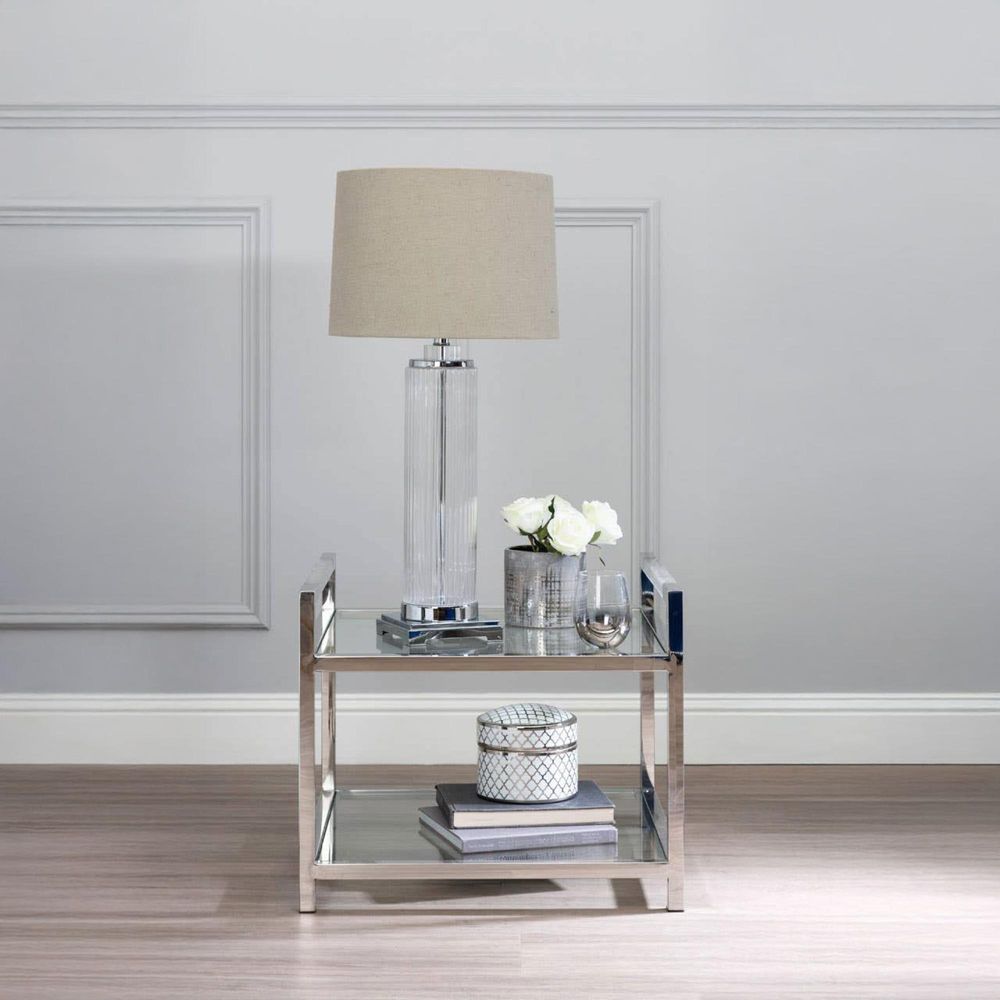 Item Code: 5501778 A highly reflective end table that adds a touch of contemporary design style to the living room.The frame of the Vogue end table is formed from smooth stainless steel and boasts a polished silver finish. It features two display tiers, each one utilising clear tempered glass to complement the steel. Transparent acrylic blocks are inserted into its upper rails. With its sleek look, it complements luxury boutique hotel furniture and lighting.