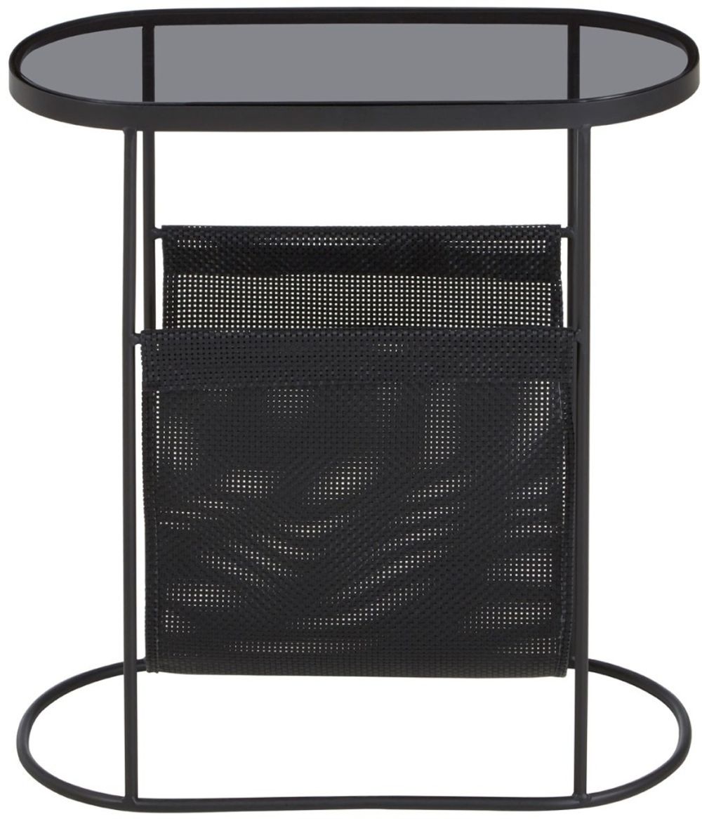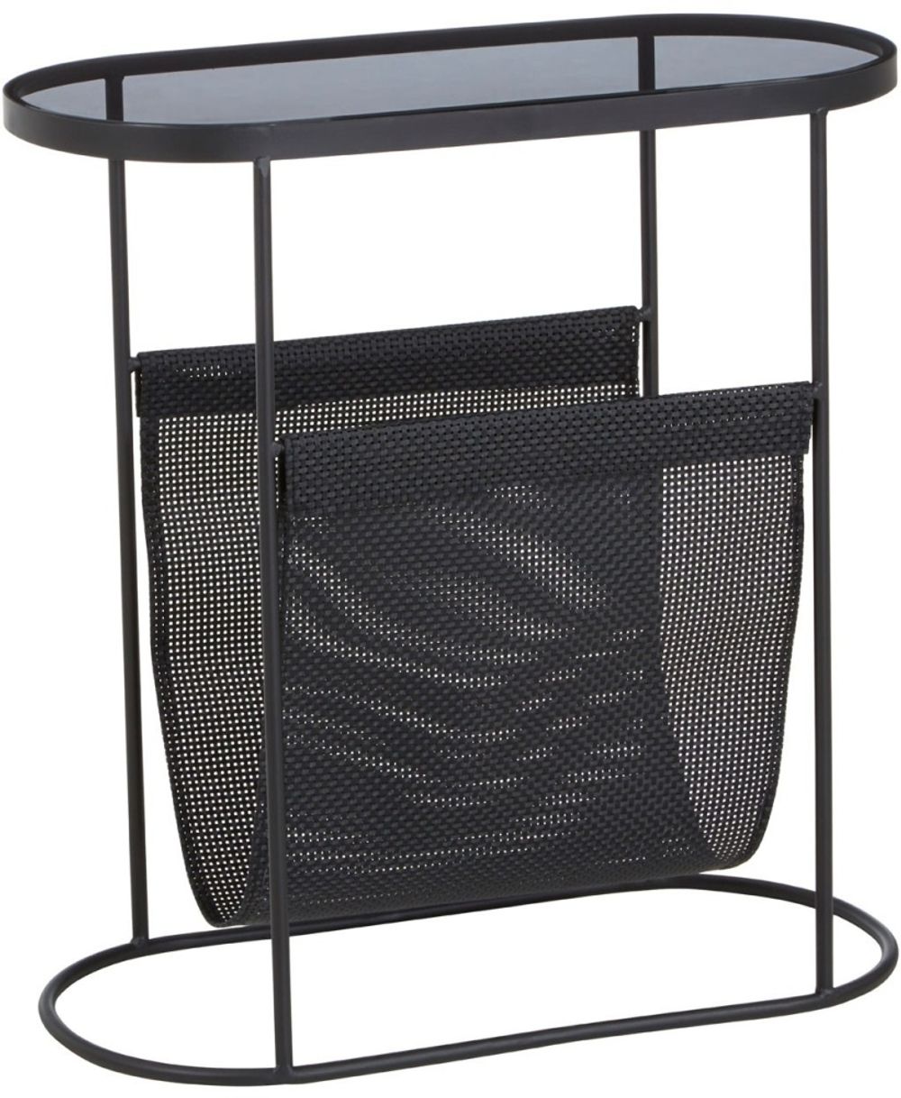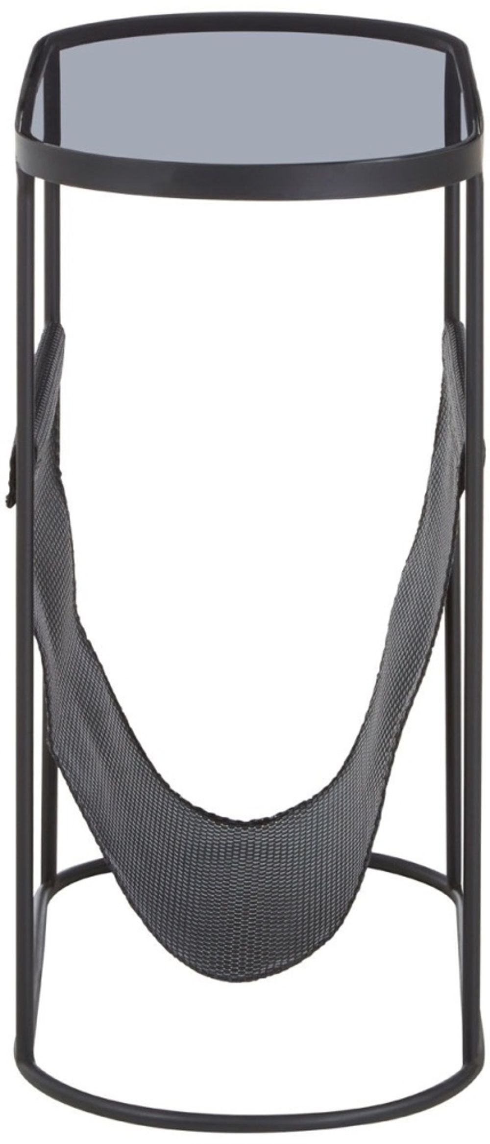 Item Code: 5502688 Featuring a minimalist design, the Trento grey glass top side table is a contemporary addition to the living room.Set on a black finish metallic base, this side table features a smoky grey glass top that keeps the contents underneath visible. Its frame is made from metal and sports a sleek black finish. Combining straight and curved lines, it retains a stylish minimalist silhouette. A hanging mesh at the centre of this frame is ideal for storing multiple small items.