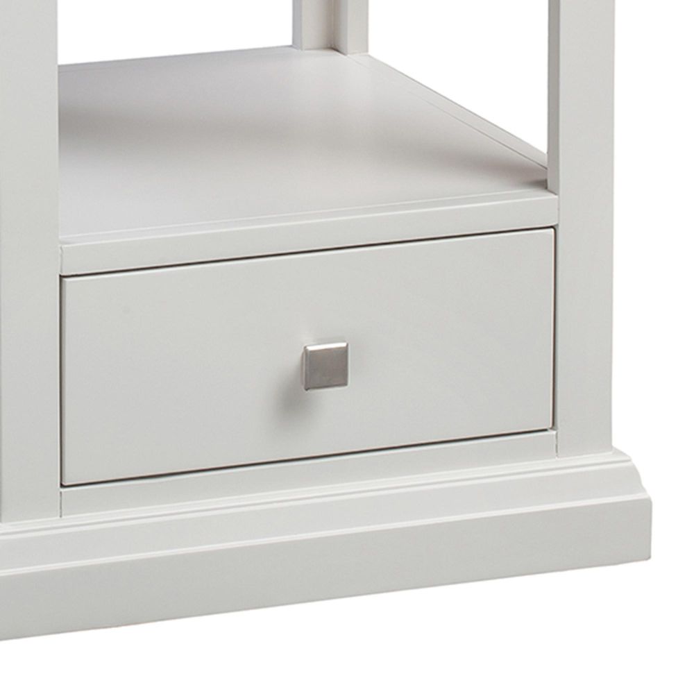 The table features one drawer for discreet storage of small items like remote controls, coasters, or reading glasses, while the open display shelf below is perfect for books, magazines, or decorative pieces. The lacquered oak top adds warmth and durability, balancing the painted frame with natural oak charm. Square metal handles add a subtle touch of rustic character to the clean, classic design.