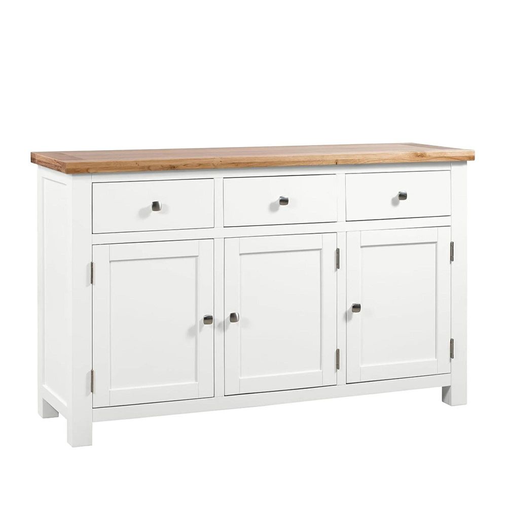 The Lundy Medium 3 Door Sideboard offers a perfect combination of timeless design and expert craftsmanship. Its clean white painted finish, paired with a light oak lacquered top, creates a fresh yet sophisticated look that suits a range of interior styles—from modern minimalism to classic elegance.