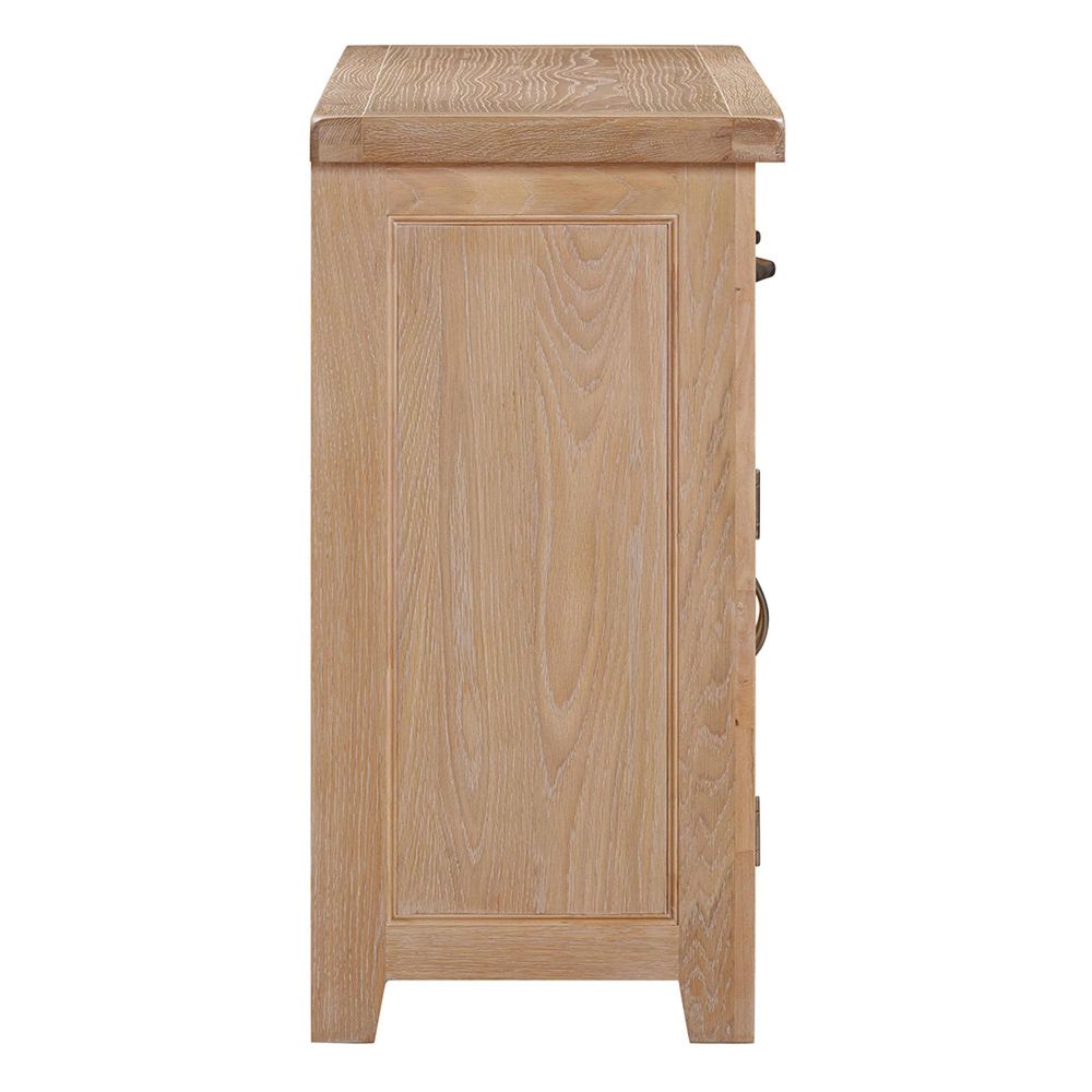 Its pale white-washed oak finish gives a natural yet contemporary look, while the chunky top with softened corners and gently tapered legs offer a balanced blend of classic and modern design. The three doors open to reveal generous storage, making it perfect for dining rooms, living areas, or hallways where both practicality and elegance are desired.