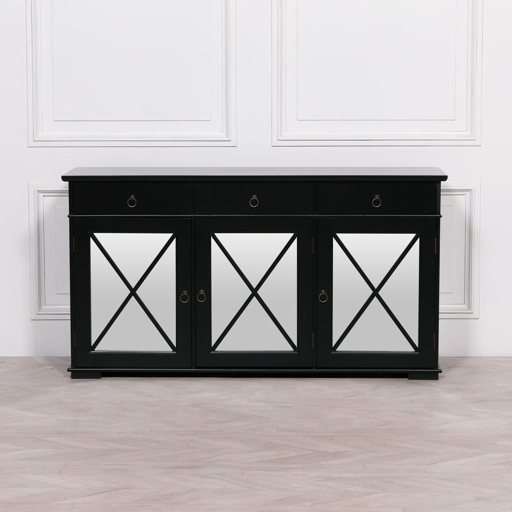 Item Code: CSF01 Black painted Oriental inspired sideboard with mirrored X faced doors and 3 drawers