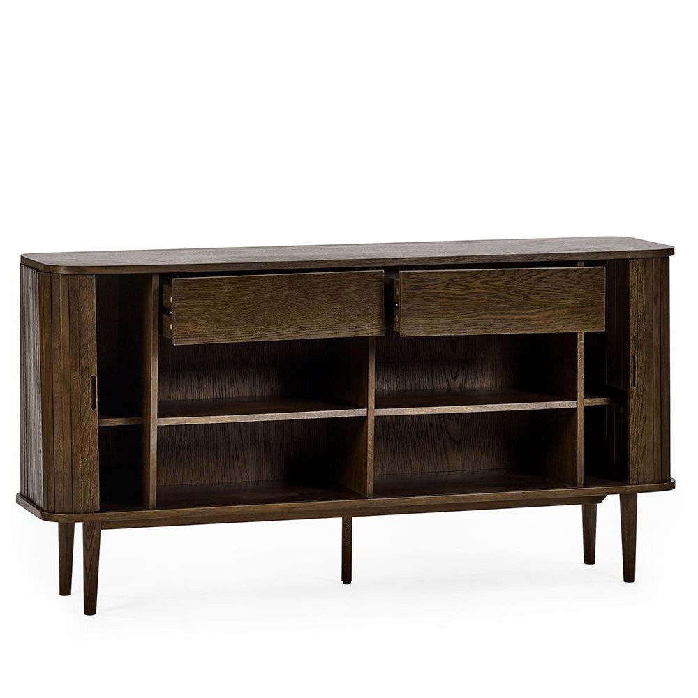 Item Code: ARY006 Discover the epitome of luxury and functionality with the Tambour Sideboard, a statement piece that combines timeless elegance with modern design. Finished in a rich dark oak effect, its slatted sliding tambour doors reveal two push-out drawers and four central shelves, with additional storage in four smaller side shelves. Featuring sleek cut-out handles and four Nordic tapered legs, adding a touch of mid-century charm to any space. Perfect for elevating your living or dining room. Minimal assembly required for quick and effortless setup.