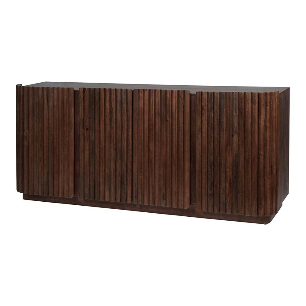 Item Code: 706193 The Monterey Wooden Four Door Sideboard is a striking and sophisticated cabinet, floating on a sleek, wooden plinth. It features intricately carved ridged lines with soft, rounded contours, crafted to enhance the wraparound design. Handmade from solid mango wood with a dark stained finish and a smooth wooden top. The spacious interior includes a fixed shelf, offering generous storage, while the door are handleless to continue the modern, streamlined aesthetic. This Sideboard is a wonderful addition to our Monterey collection.