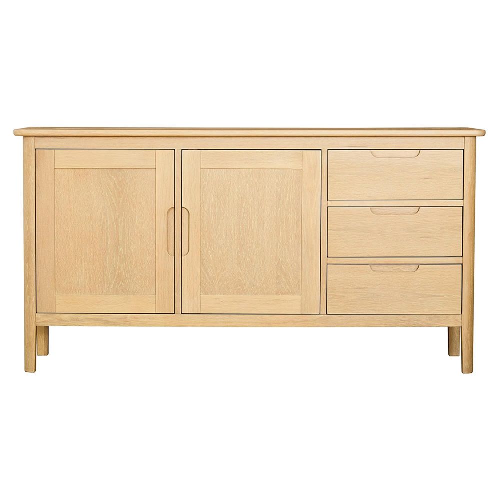 This sideboard features two spacious cupboards with internal shelving, perfect for storing tableware, glassware, or household essentials. In addition, three dovetailed drawers with finger-grooved handles provide smooth, reliable storage for cutlery, linens, or everyday items. Finished with rounded tops, softly curved corners, and slim tapered legs, the piece balances durability with an elegant, modern rustic look.