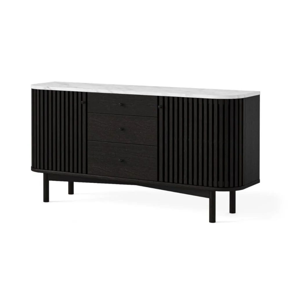 The Soho Black 2 Door Slatted Sideboard – 140cm is a timeless blend of craftsmanship, elegance, and functionality. Expertly built from premium oak and oak veneers, it features a refined black finish that highlights the natural texture of the wood. The smooth white marble top with gentle grey veining adds a luxurious contrast, creating a sophisticated focal point for dining or living spaces.