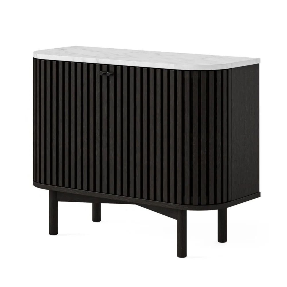 The Soho Black 2 Door Slatted Small Sideboard is a beautifully balanced piece that combines craftsmanship, function, and refined design. Made from premium oak and oak veneers, it features a smooth black finish that accentuates the natural wood grain, complemented by a striking white marble top with delicate grey veining. Compact yet elegant, this sideboard is ideal for smaller dining rooms, living spaces, or hallways where smart storage and timeless style are equally important.