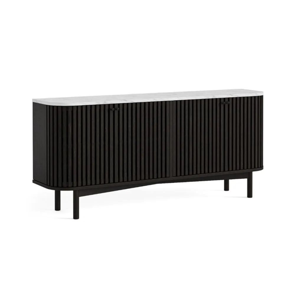 The Soho Black 4 Door Slatted Large Sideboard combines timeless craftsmanship with refined modern style. Built from premium oak and oak veneers, this elegant piece showcases the beauty of natural materials through its smooth slatted doors and sleek black finish. The striking white marble top with soft grey veining adds a touch of sophistication, making it a statement piece in any dining or living space.