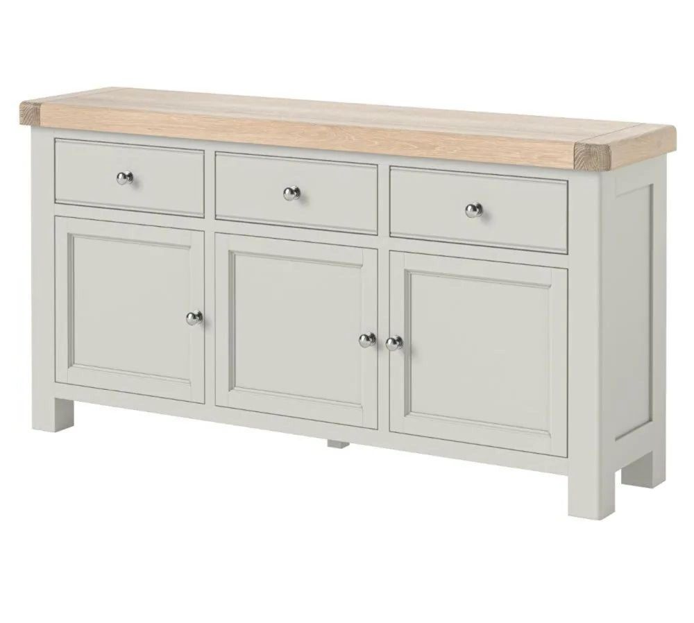 The Salcombe Grey Oak 3 Door Large Sideboard combines classic craftsmanship with contemporary design, creating a timeless storage piece for the modern home. Built from oak, solid wood, oak veneers, and mixed woods, this sideboard offers both beauty and strength. Its chunky tops and sturdy legs lend a sense of solidity, while the stone grey painted finish pairs beautifully with the natural oak top, adding warmth and texture to any living or dining space.