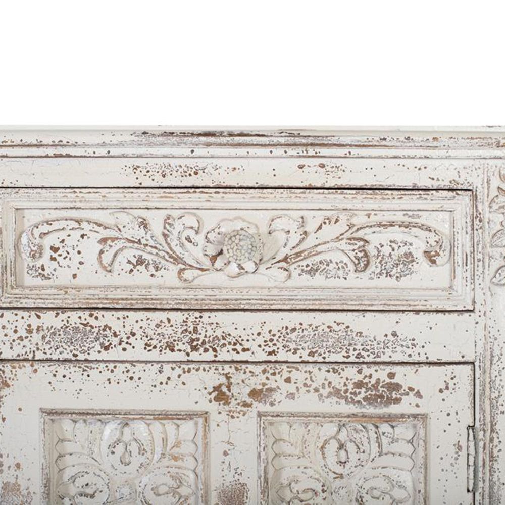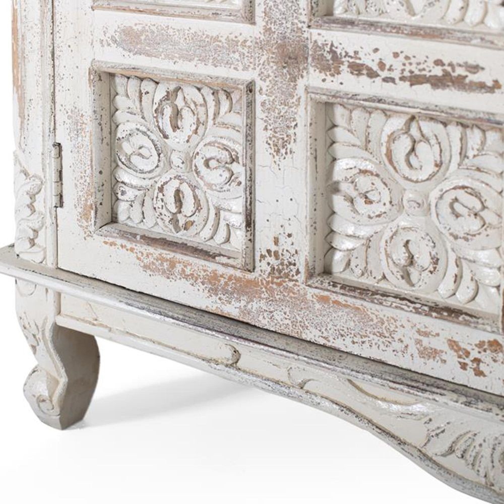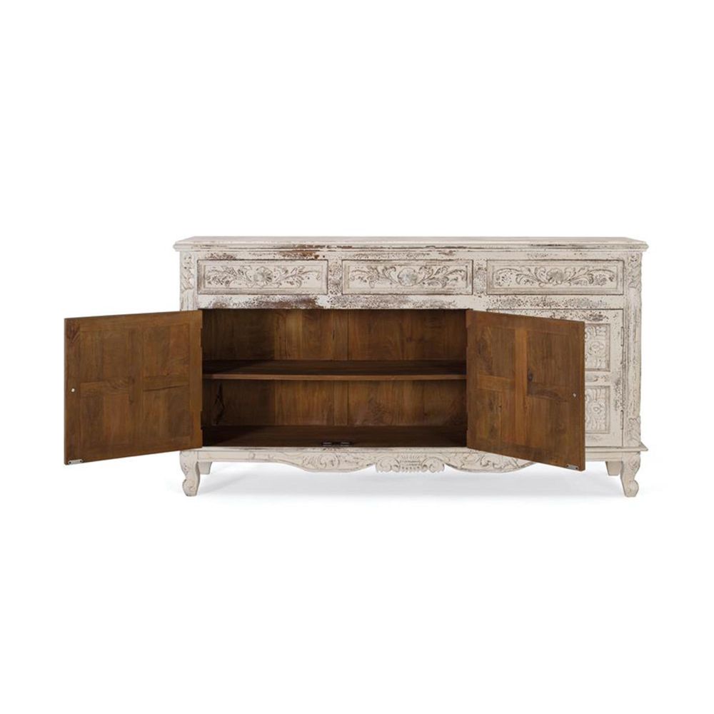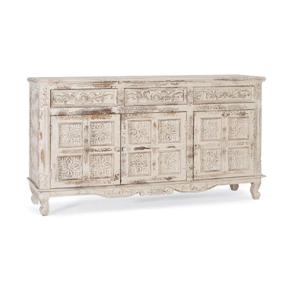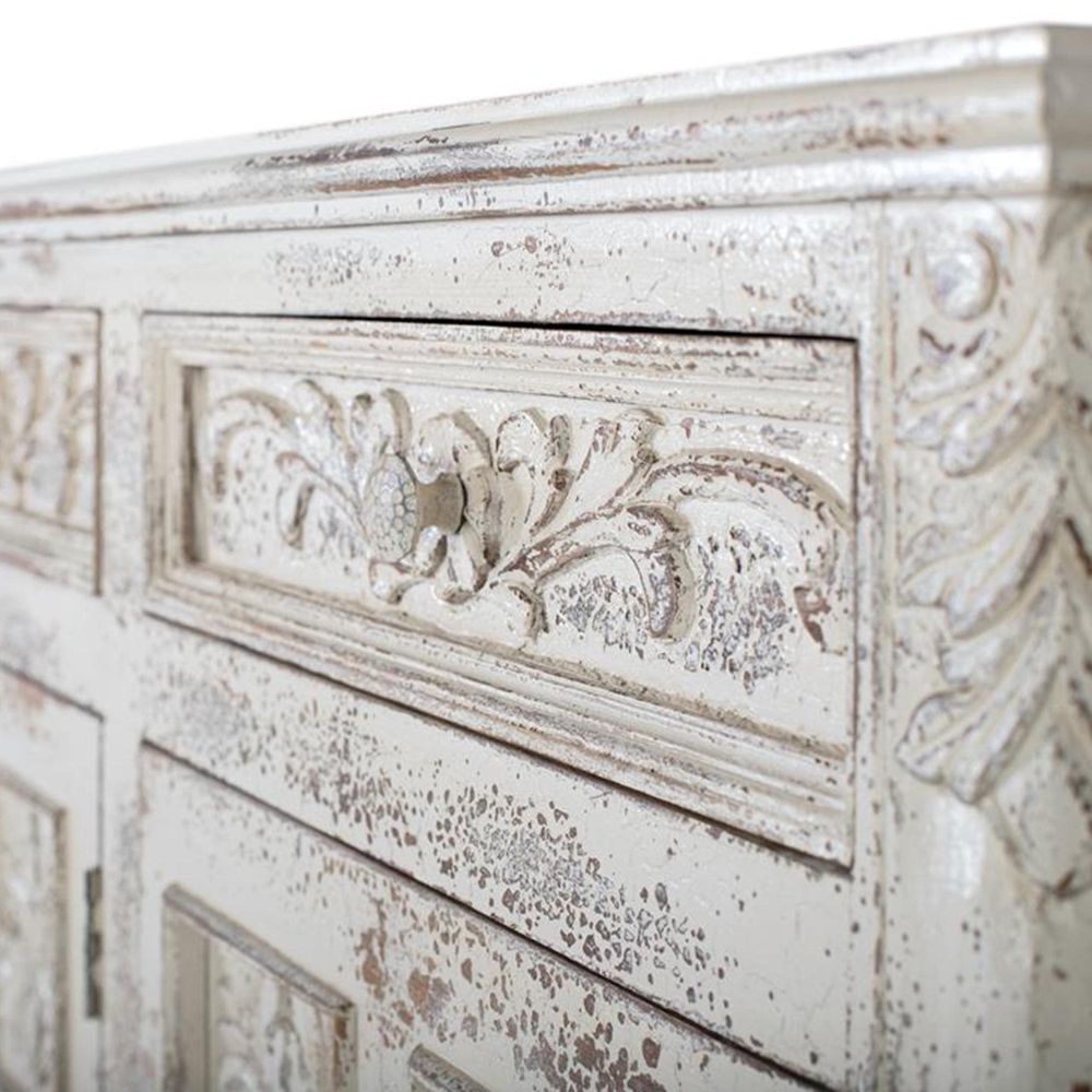 Item Code: 1482 Sideboard Made Of Solid Mango Wood, In Crackled White, With 3 Hand Carved Doors And 3 Interior Shelves. As It Is Natural Wood, It May Come With Its Original Knots And Grain.