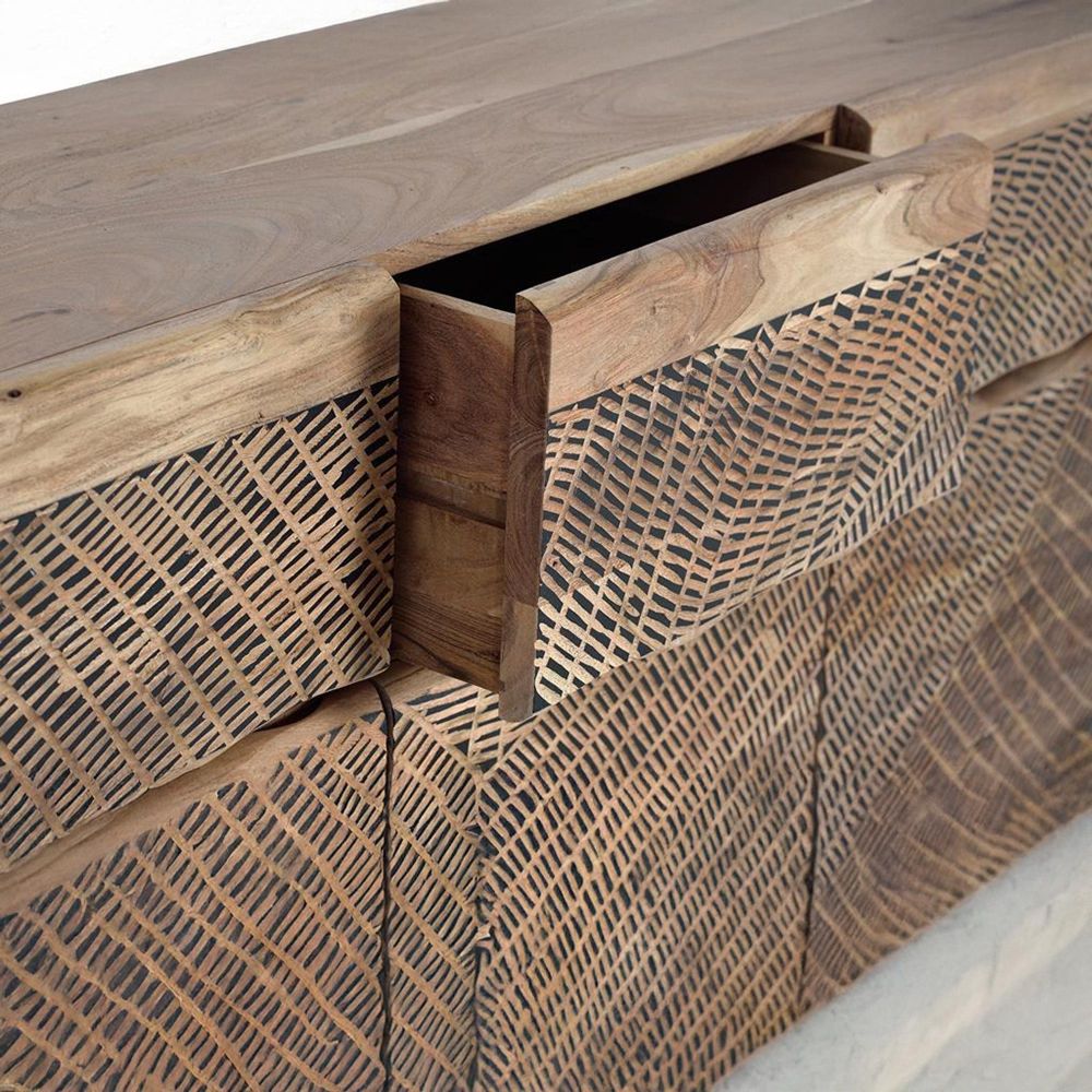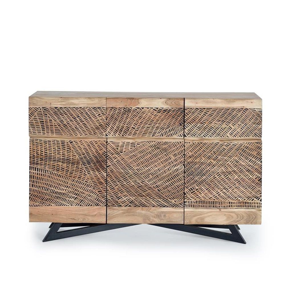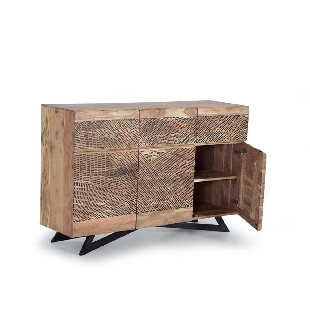 Item Code: 1094 Sideboard With 3 Drawers And 3 Doors In Acacia Wood And Metal Legs.Hand Carved Fronts And Hinges With Braking System