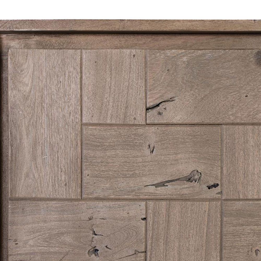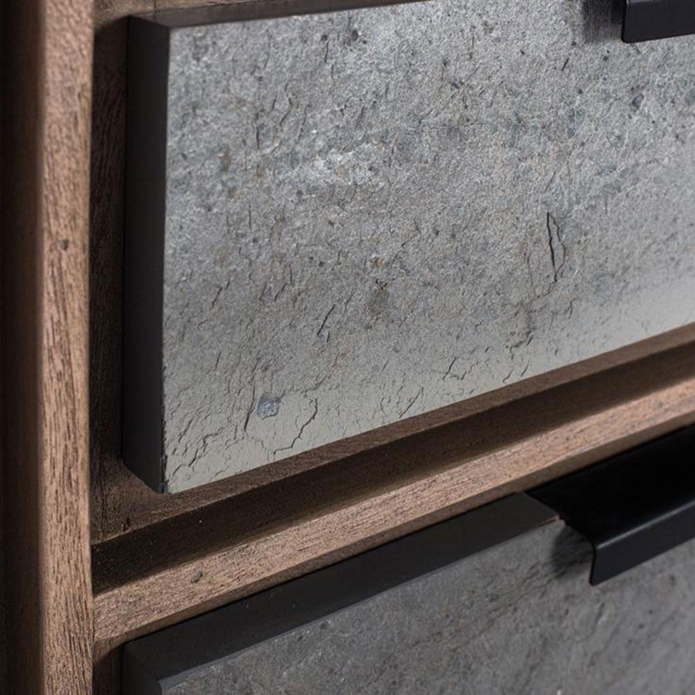 Item Code: 1836 Sideboard made of acacia wood, combines functionality and design with a natural and textured touch. It features two doors and three drawers, offering ample storage space for various items. The fronts of the doors and drawers are adorned with a stone veneer finish, adding a visual and tactile contrast that highlights its rustic and modern style.The acacia wood is finished in a sand tone that highlights its natural grains and gives it a warm and welcoming appearance. In addition, the sandblasted finish gives it a slightly grayish texture, creating a rustic and nuanced effect that enhances the beauty and authenticity of the wood.