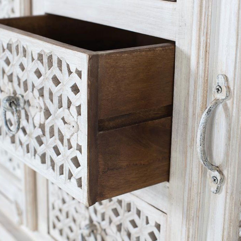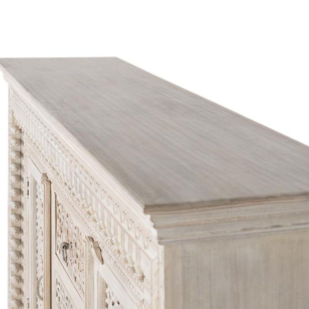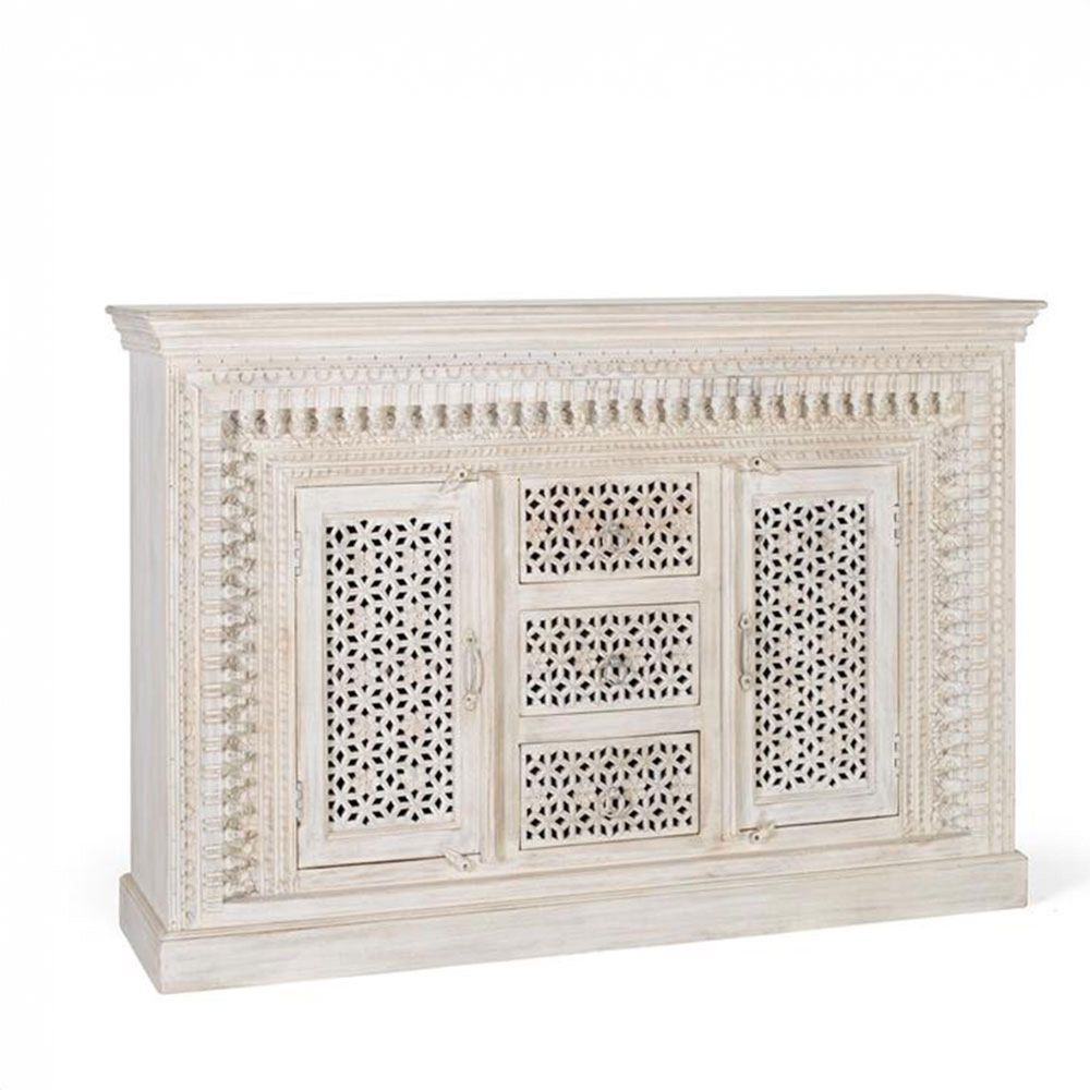 Item Code: 1513 Sideboard made of solid mango wood in aged white, with 2 doors and 3 drawers, all hand-carved, inside the doors have 1 interior shelf. Being natural wood, it can come with its original knots and veins.