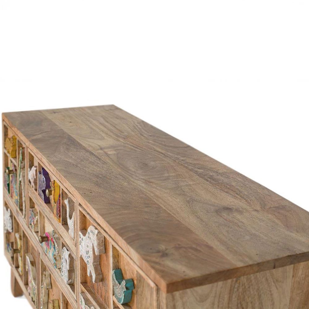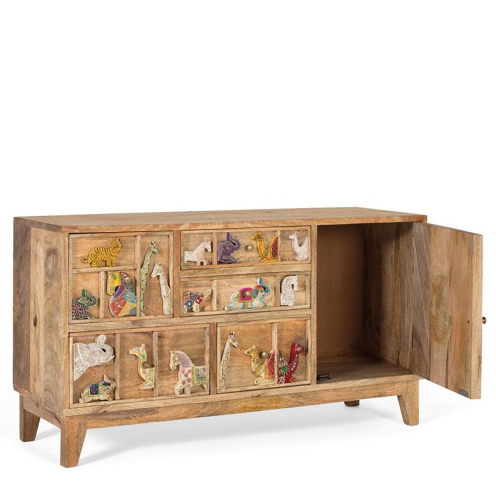 Item Code: 1792 This Sideboard is made of mango wood. It has five drawers and a side door, all decorated with unique details. The fronts of the drawers and the door are decorated with figures of different animals, hand-carved in great detail. Each animal, carved with precision in relief, is hand-painted in bright colours, which gives an artistic and lively touch to the piece of furniture.