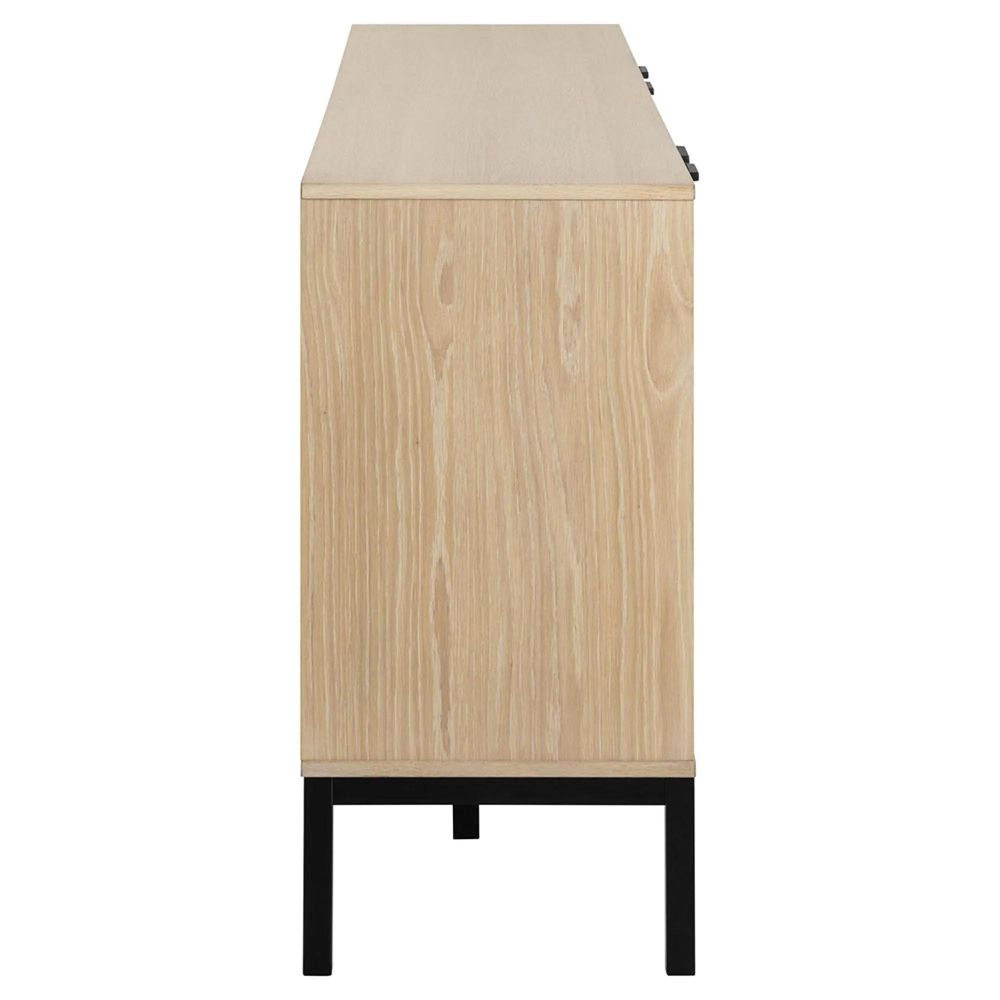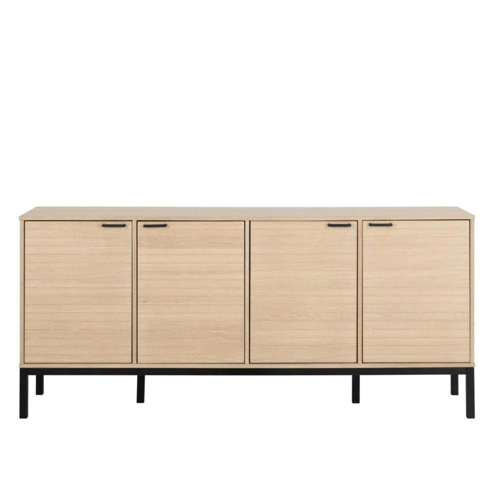 Kensington sideboard, top, frame, 4 doors and 4 shelves white pigmented oiled oak veneer, base matt black NC lacquered oak with lamella front, 180x40x80 cmThis striking sideboard invites a refreshing energy into the interior. Through its contrasting appearance, achieved by blending the white pigmented oiled oak veneer and black lacquered oak, the sideboard enhances the dynamics in the room. It is designed with 4 adjustable shelves that are concealed behind 4 doors adorned with decorative lamellas.