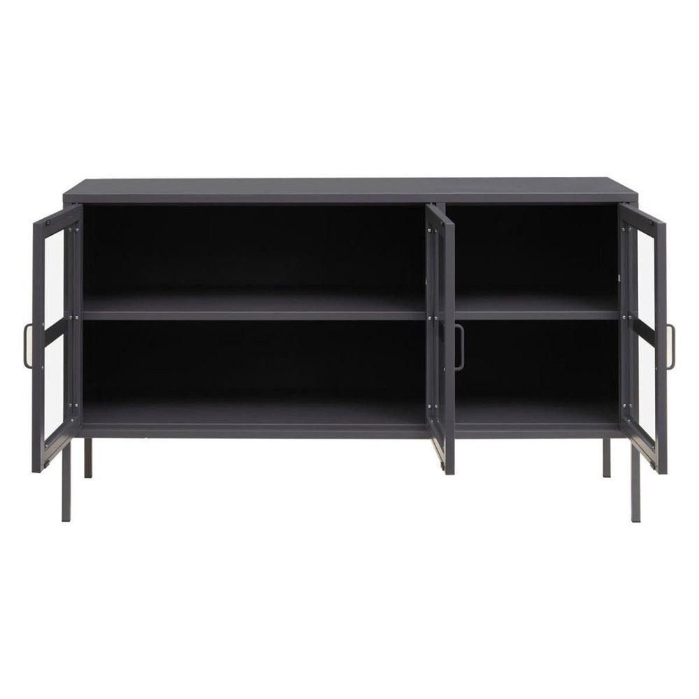 Item Code: 2406600 Add style and storage to the dining room or entryway with the Acier grey metal sideboard exhibiting industrial character.This sideboard has three glass doors revealing adjustable inner shelves for storing or decorative items. The sturdy grey powder coated metal design with matching handles and sleek legs creates a simple and streamlined classic aesthetic.