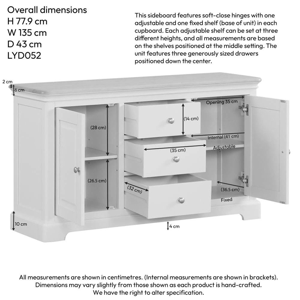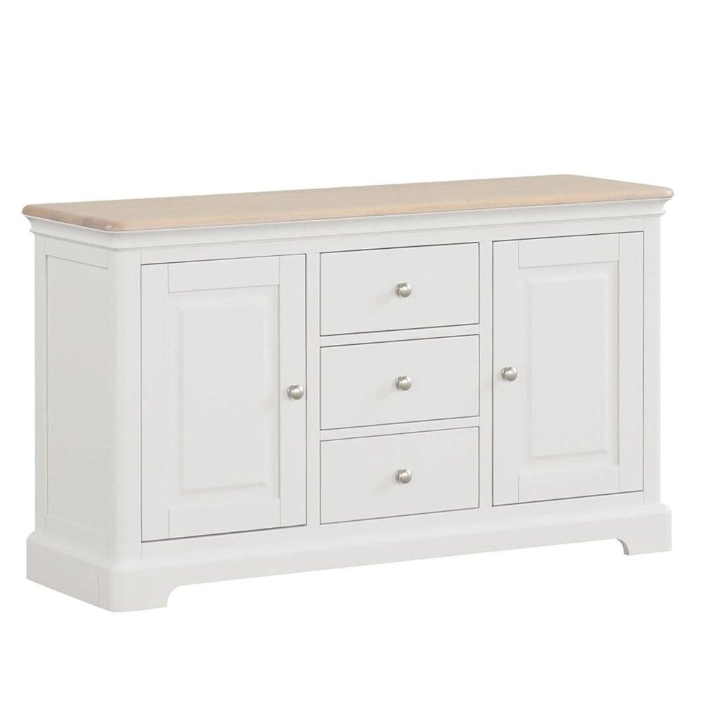 This beautifully crafted 2 door 3 drawer painted sideboard combines clean, modern design with a charming country twist. Gently curved edges and an elegant painted finish bring a contemporary softness, while the solid oak top adds warmth and natural character. Perfect for any living or dining space, it offers generous storage behind two smooth closing doors and 3 generous drawers?ideal for keeping your home clutter free in style.
