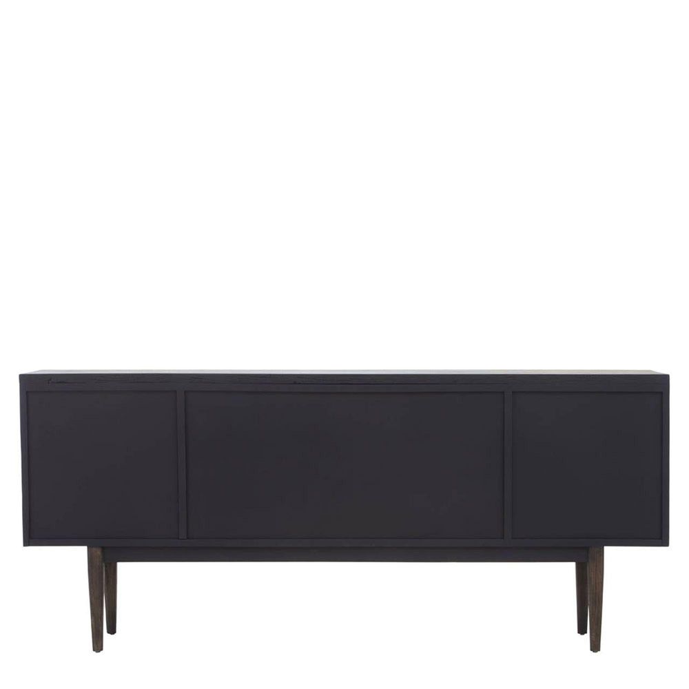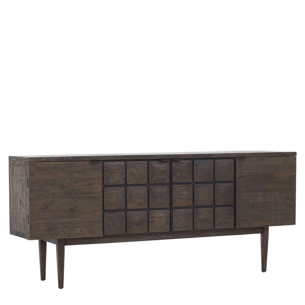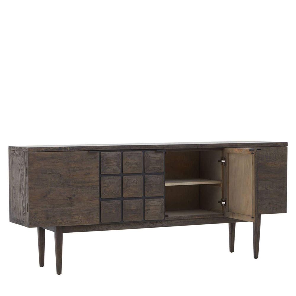 Item Code: 5528750 The Lucca sideboard is crafted from dark-finish reclaimed oak wood and features geometric square panel details, offering ample storage and visual intrigue to the interior.This sideboard is a statement piece, combining contemporary design with eco-friendly materials. Crafted from rich, dark-toned reclaimed oak wood, each piece carries its own unique character. The centre doors feature a distinctive geometric pattern of square panels, adding texture and visual interest.