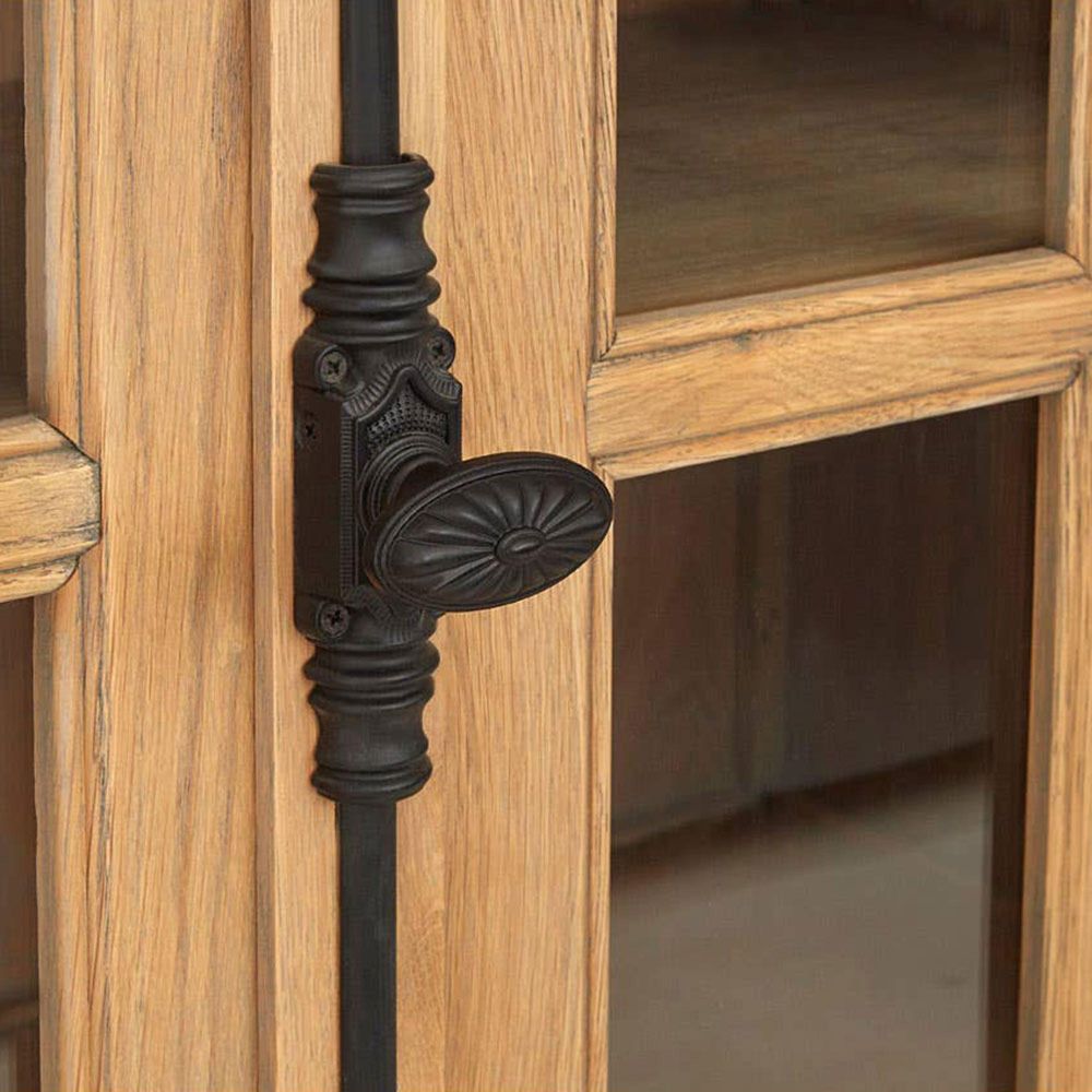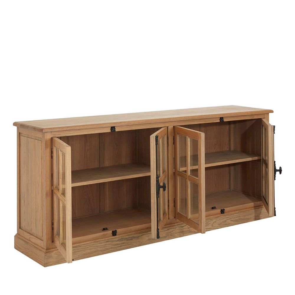 Item Code: 2404973 The subtly sculpted plinth base of the Lyon sideboard complements its carved sides, contributing to the rustic style of this significant piece.Four glass panelled doors open to reveal a shelf, perfect for storage and display purposes. Juxtaposing the golden wood is a pair of intricately carved handles, made from black metal. This wooden sideboard will complement most decor settings.