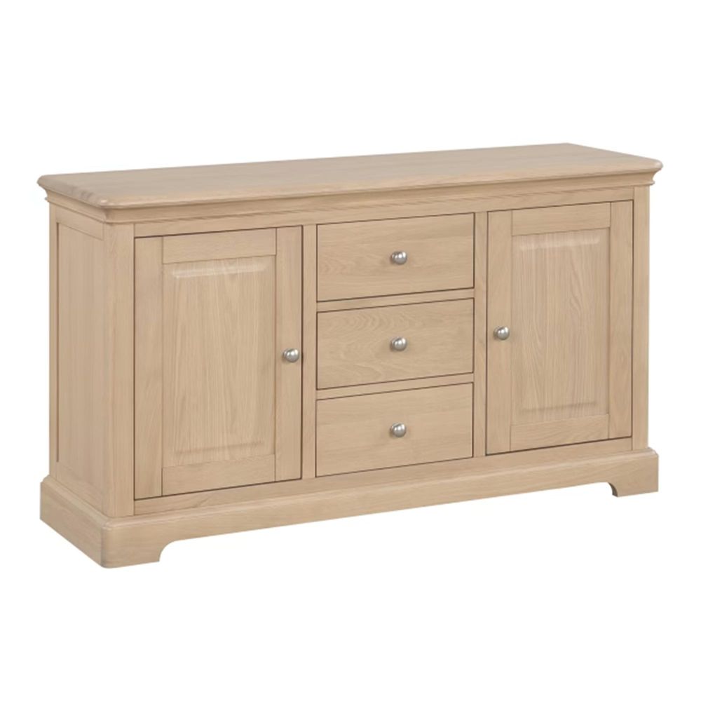 Item Code: LOK052 A touch larger for even more storage, this elegant sideboard features a charmingly elegant country look with gently curved edges, a warm oak finish, and a solid oak top. With two cupboards, each with an adjustable shelf and three drawers, it's ideal for storing everything from dinnerware to paperwork keeping your home tidy in timeless style.