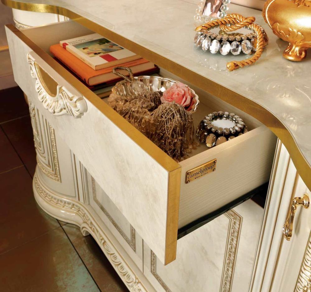Item Code: 123BF4.01OP Curved hedge in gold leaf finish. Hanging handle with crystal.Leonardo bedroom completes a collection in which the baroque style and classic lines combine to create an environment that evokes the splendor of the 1600 palaces. Gold details on ivory high gloss panels and arabesque decorations with Art-Deco handles make this room an obvious choice for those who love classic timeless atmosphere.This is a Made to Order itemAll Made to Order items are manufactured as per the order supplied by you.We are unable to accept cancellation or accept any extra cost that may incur due to wrong information provided by you at the time you placed the order.We will confirm all sizes/colours/finishes in written email (order confirmation) with you before going ahead with production of your order.