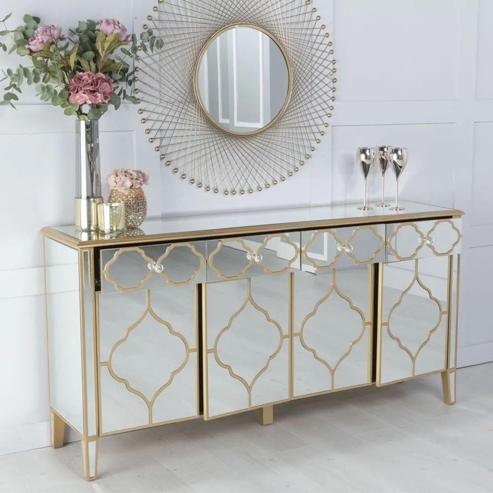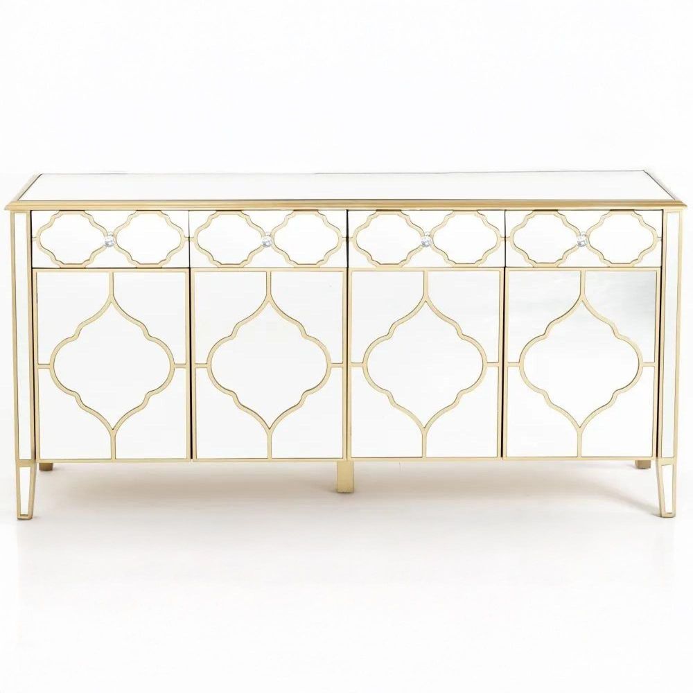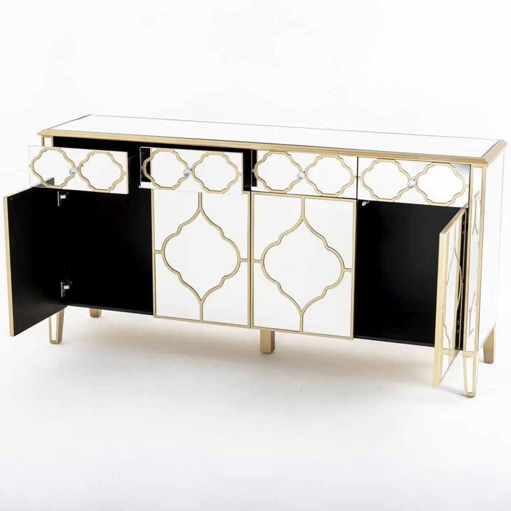 Bring refined elegance and practical storage into your home with the Casablanca Mirrored Gold Trim 4 Door Large Sideboard. Designed with a striking mirrored finish and detailed with ornate gold trim, this sideboard combines timeless craftsmanship with modern functionality. Its wide 170cm top makes it ideal for displaying statement décor pieces, while the generous storage within ensures everything has its place.