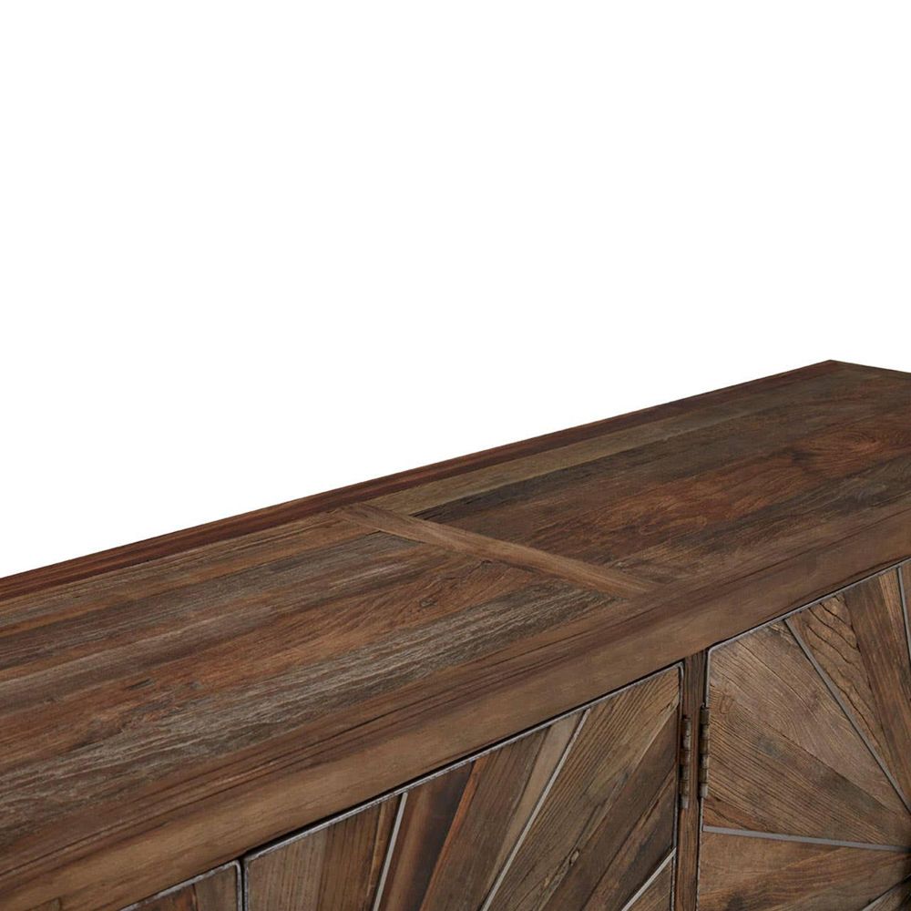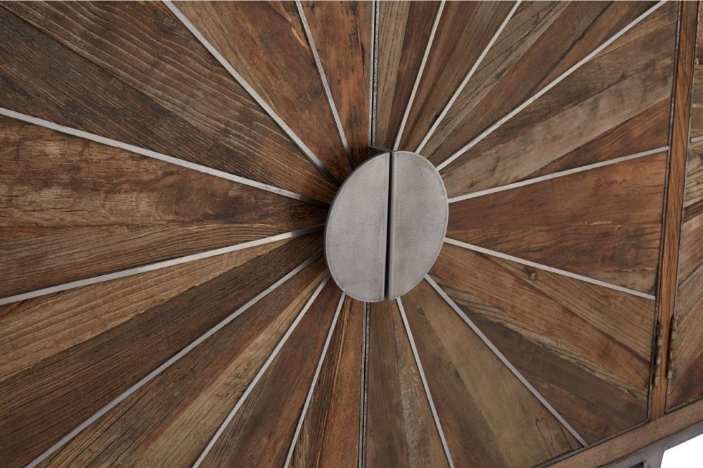 Item Code: 5502400 The Midas sideboard combines natural wood and iron to create an exotic boho look.The wide cabinet is crafted from textured elm wood, with different shades arranged in strips for tonal contrast. It features four doors at the front, inlaid with silver coloured steel to produce a metallic sunburst effect. Round silver iron handles and short silver iron feet coordinate with the lines.