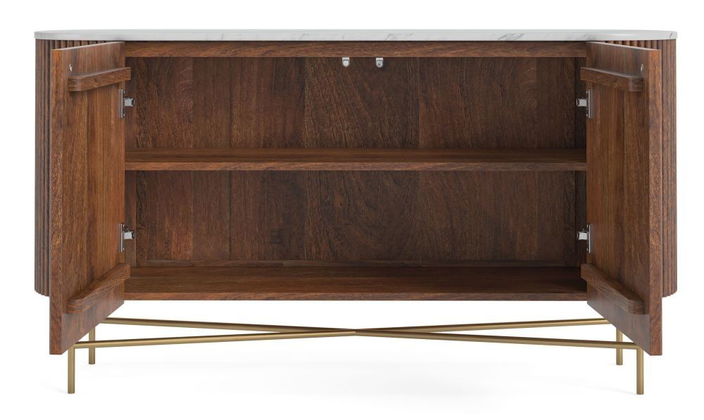 The Harvard 150cm Medium Fluted Curved Sideboard is a perfect combination of timeless design, premium materials, and functional storage. Crafted from solid mango wood with a rich walnut finish, it features a curved fluted front that adds elegance and sophistication to any dining room or living space. The white Calacatta marble top is heat-resistant, durable, and naturally unique, with subtle veining and mineral patterns in grey, brown, pink, or green.