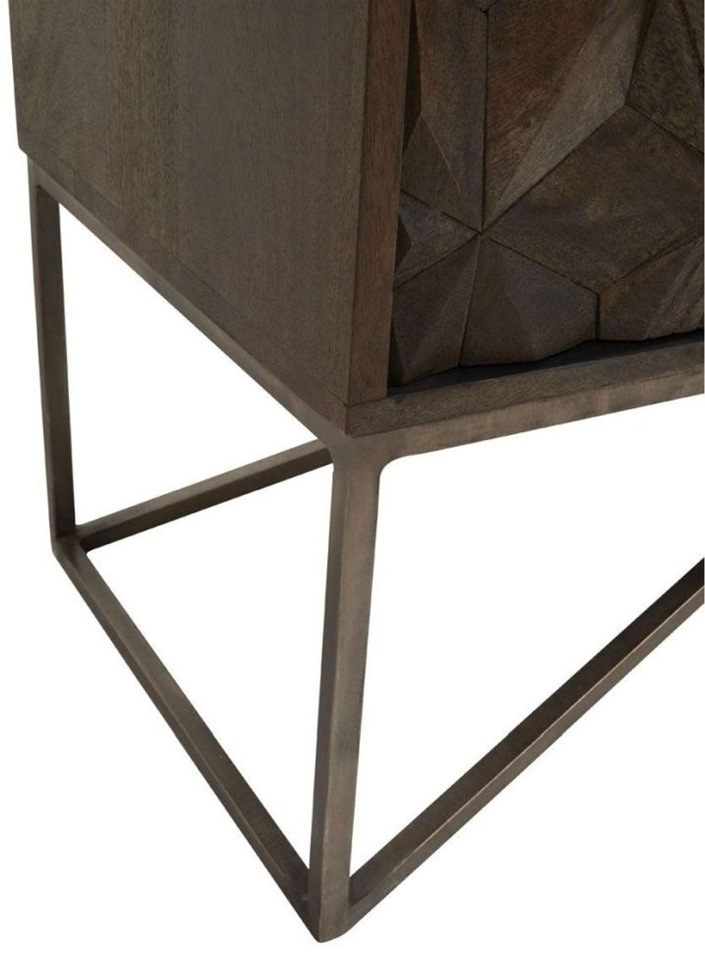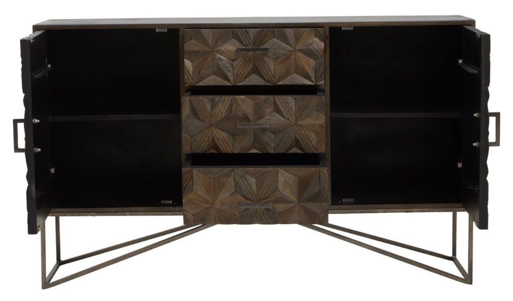 Item Code: 5529144 Made from solid mango wood in grey shade, the sideboard's transitional design is both modern and unique. It dons an elegant, geometric flowery pattern on the front which compliments linear and durable metal base with an expansive surface and a roomy storage.This sideboard features a geometric flowery pattern in grey finish with structure placed on a sturdy metal frame. It is produced with mango wood making it long lasting. Made from solid mango wood in grey shade, the sideboard's transitional design is both modern and unique. It dons an elegant, geometric flowery pattern on the front which compliments linear and durable metal base with an expansive surface and a roomy storage.