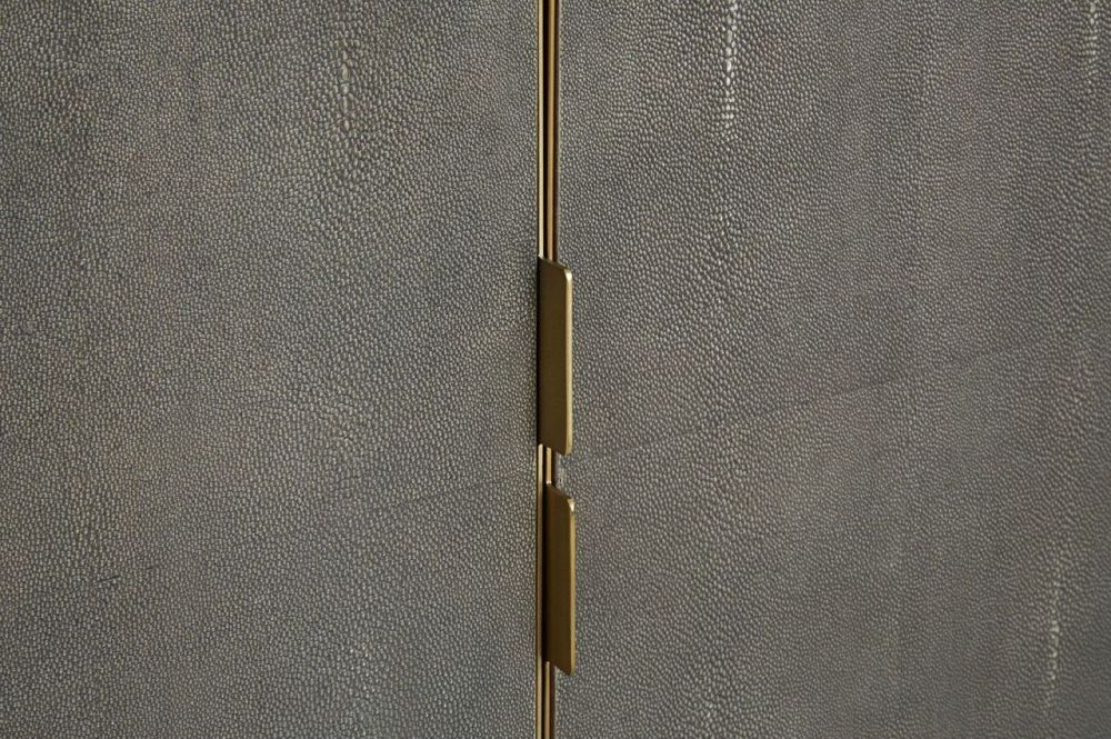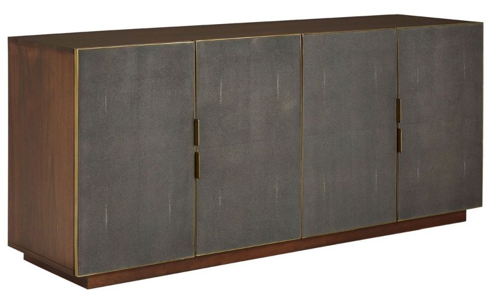 Item Code: 5527513 A statement sideboard with doors covered in luxuriously tactile shagreen.The top, sides and base of the cabinet are made from richly coloured walnut veneer. This complements the brass coloured trim and handles. The shagreen that covers its four doors provides an unusual textured finish.