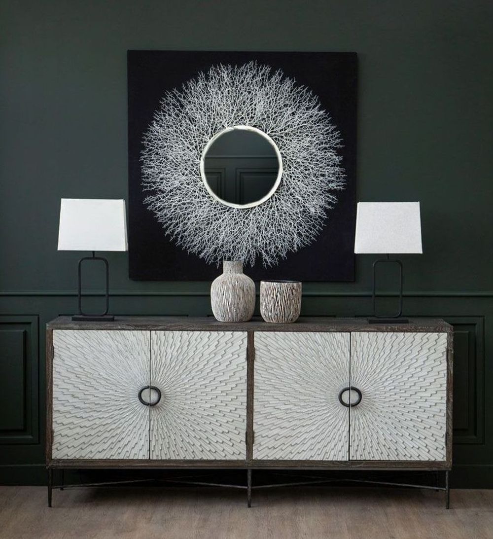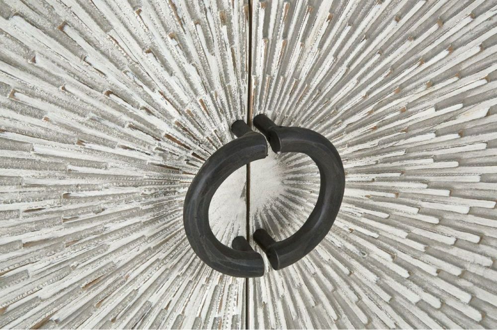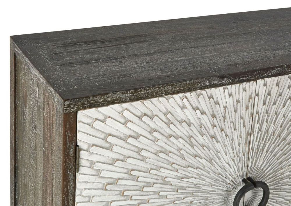Item Code: 5527521 A substantial statement sideboard made from solid wood with metallic accents.The Milan sideboard is crafted from sustainable grey elm wood. Its grain is accentuated by silver flecks, complementing the metallic starburst pattern on its doors. The doors open to reveal generous storage space.
