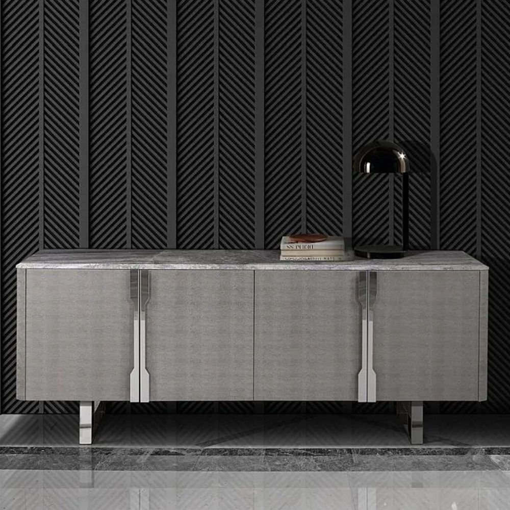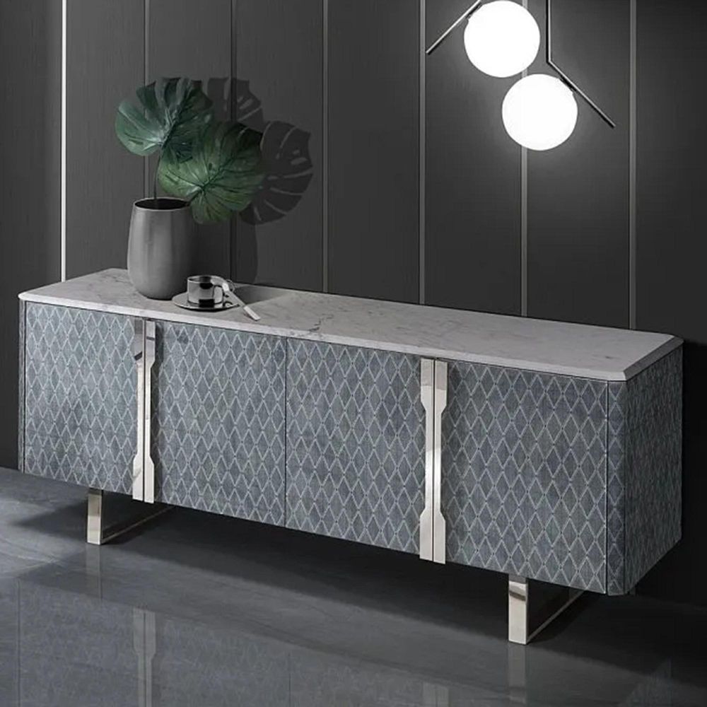 Item Code: Note : Custom made sizes available please contact us on 0116-296-3800.The Diamond buffet is striking modern in nature. The top, the sides and the gorgeous metal handles are crafted like diamond jewels. 4 Doors buffet with upholstered sides and doors, metal handles and base in polished steel (PS) or any available metallic finishes. "Diamond shape" thin bevel top in any available marble finish.