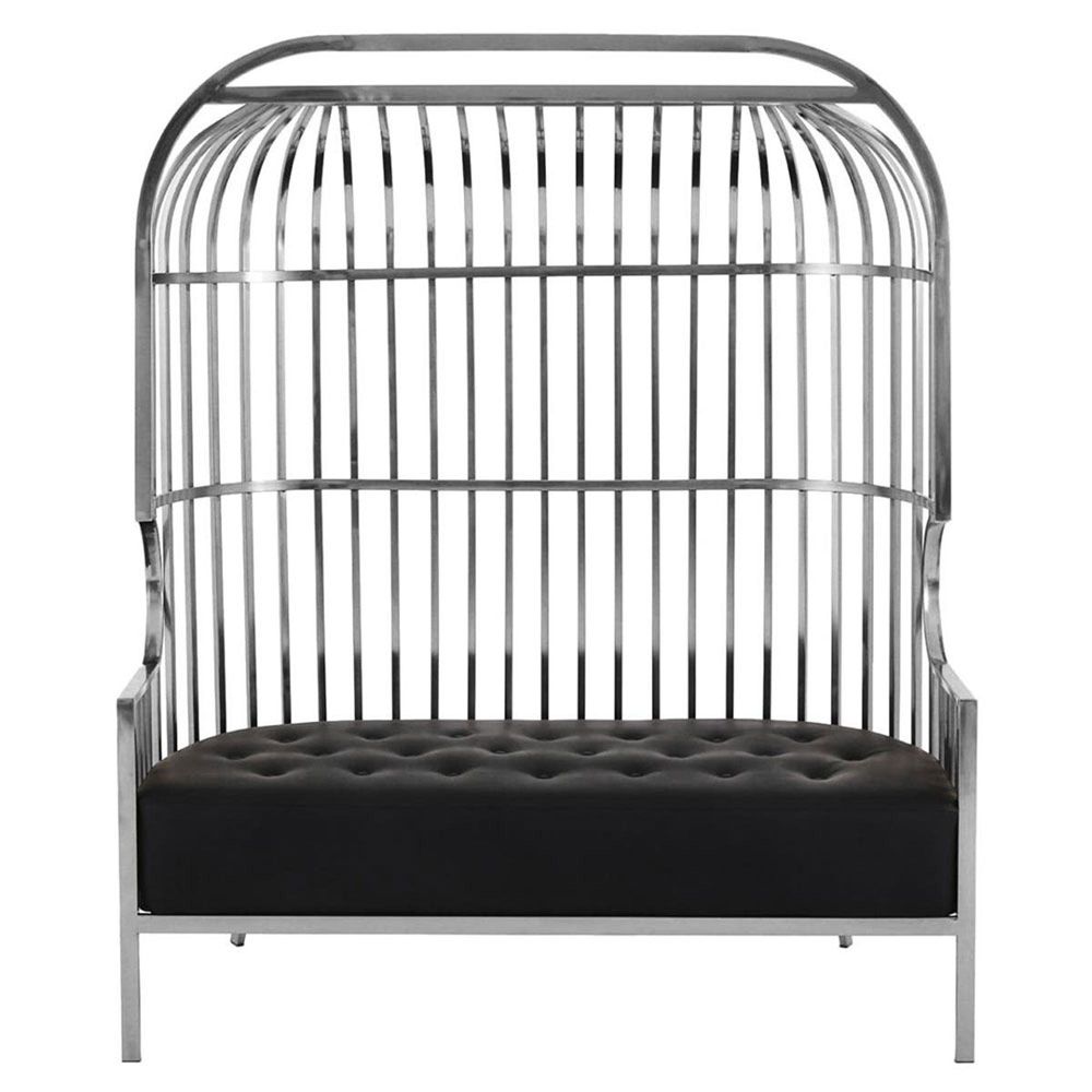 Item Code: 5528552 The Eliza two seat sofa with silver finish frame brings a modern take on seating with its unique cage style design.With a bird cage like design in reflective silver finish, this two seat sofa features cage bars which combine from the top to form a dome shape over the chair. Generously cushioned seat is covered in black faux leather and contrasts the high shine polish to make a statement.