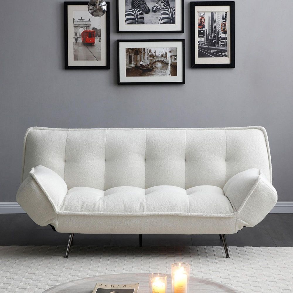 Item Code: R81 An all-new Click Clack 3 seater sofa bed designed for modern living. Adjustable arms on both sides allows tailoring of seating experience for your comfort.Standout feature of the Regis Sofa Bed is the new mechanism which creates a sleek sofa, while the hidden legs produce a dependable bed.It is upholstered in sherpa fabric, which adds coziness and luxury to the sofa bed, inviting you to relax and unwind.The sleek Black Chrome Feet add a modern design while providing stability and durability.Available in two colours, Cream and Grey, the Regis Sofa Bed fits seamlessly into many interior styles.