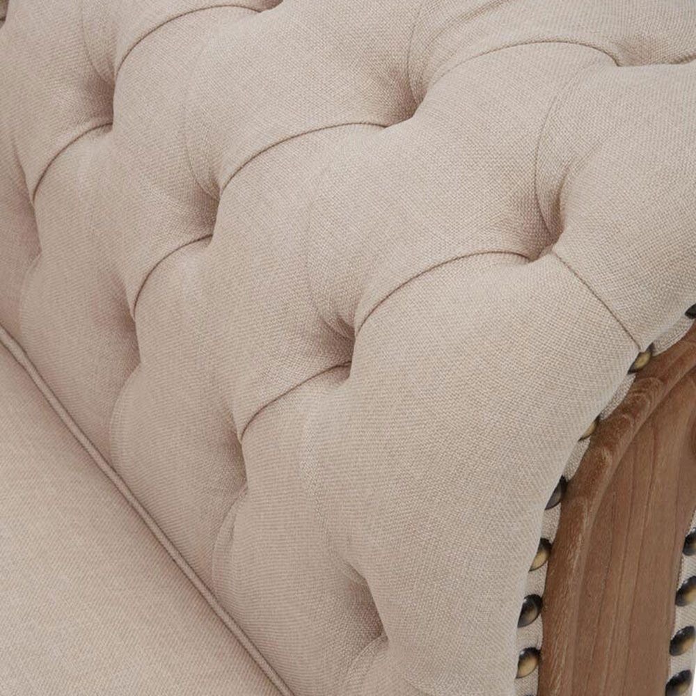 Item Code: 5527856 This elegant cream fabric armchair boasts a classic Chesterfield design with button-tufting, rolled arms, and stud detailing. This classic armchair brings timeless elegance and luxurious comfort to any space. It is upholstered in a cream fabric and showcases a distinctive Chesterfield design, evident in its button-tufted backrest and gracefully rolled arms. Adding to its traditional charm, the chair features decorative stud detailing along the front of the arms and stands on elegant mahogany wood legs, completing its sophisticated appeal.