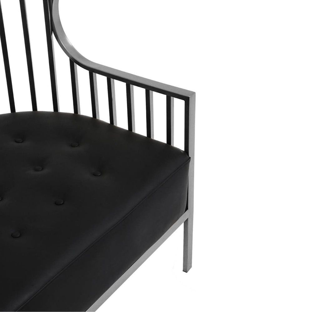 Item Code: 5528552 The Eliza two seat sofa with silver finish frame brings a modern take on seating with its unique cage style design.With a bird cage like design in reflective silver finish, this two seat sofa features cage bars which combine from the top to form a dome shape over the chair. Generously cushioned seat is covered in black faux leather and contrasts the high shine polish to make a statement.
